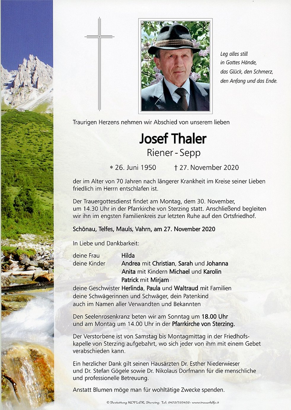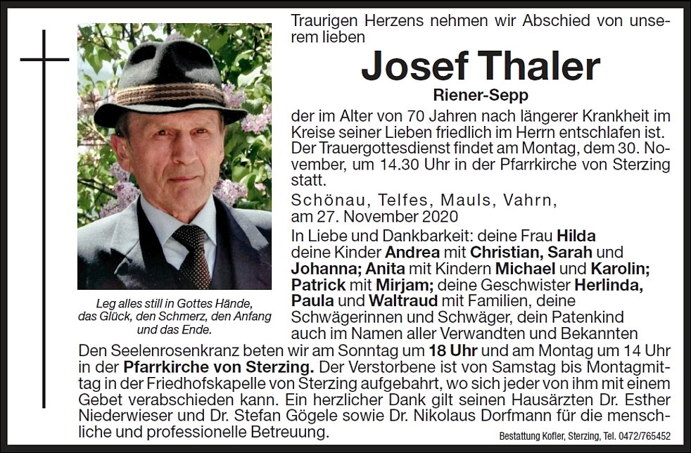 Der Trauergottesdienst findet am Montag, dem 30. November, um 14.30 Uhr in der Pfarrkirche von Sterzing statt. Anschließend begleiten wir ihn im engsten Familienkreis zur letzten Ruhe auf den Ortsfriedhof.