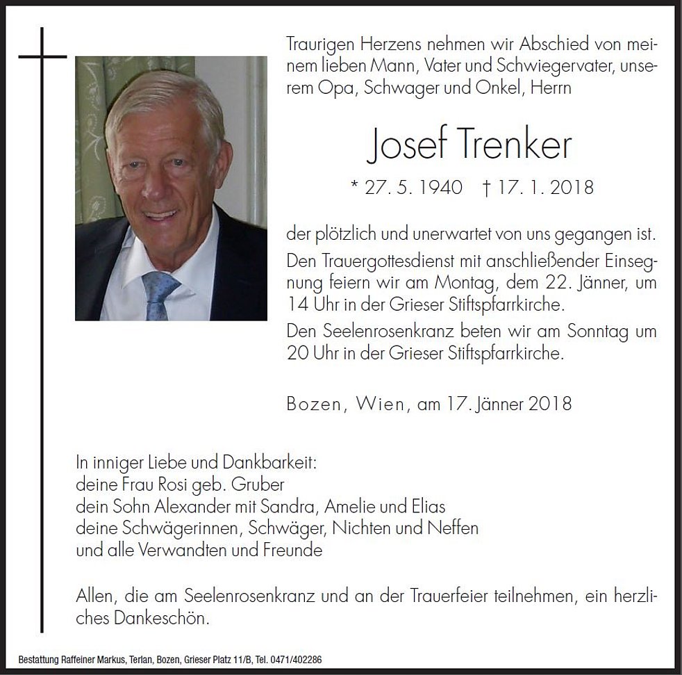 Den Trauergottesdienst mit anschließender Einsegnung feiern wir am Montag, dem 22. Jänner, um 14 Uhr in der Grieser Stiftspfarrkirche.