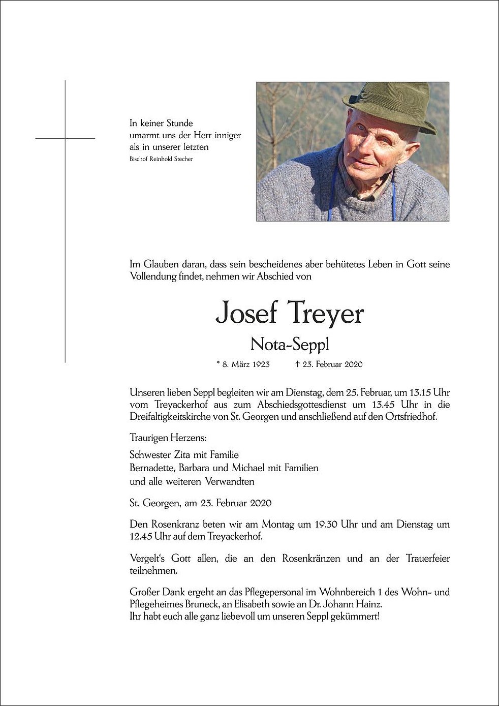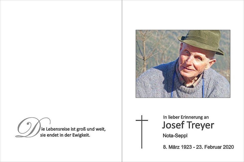 Unseren lieben Seppl begleiten wir am Dienstag, dem 25. Februar, um 13.15 Uhr vom Treyackerhof aus zum Abschiedsgottesdienst um 13.45 Uhr in die Dreifaltigkeitskirche von St. Georgen und anschließend auf den Ortsfriedhof.