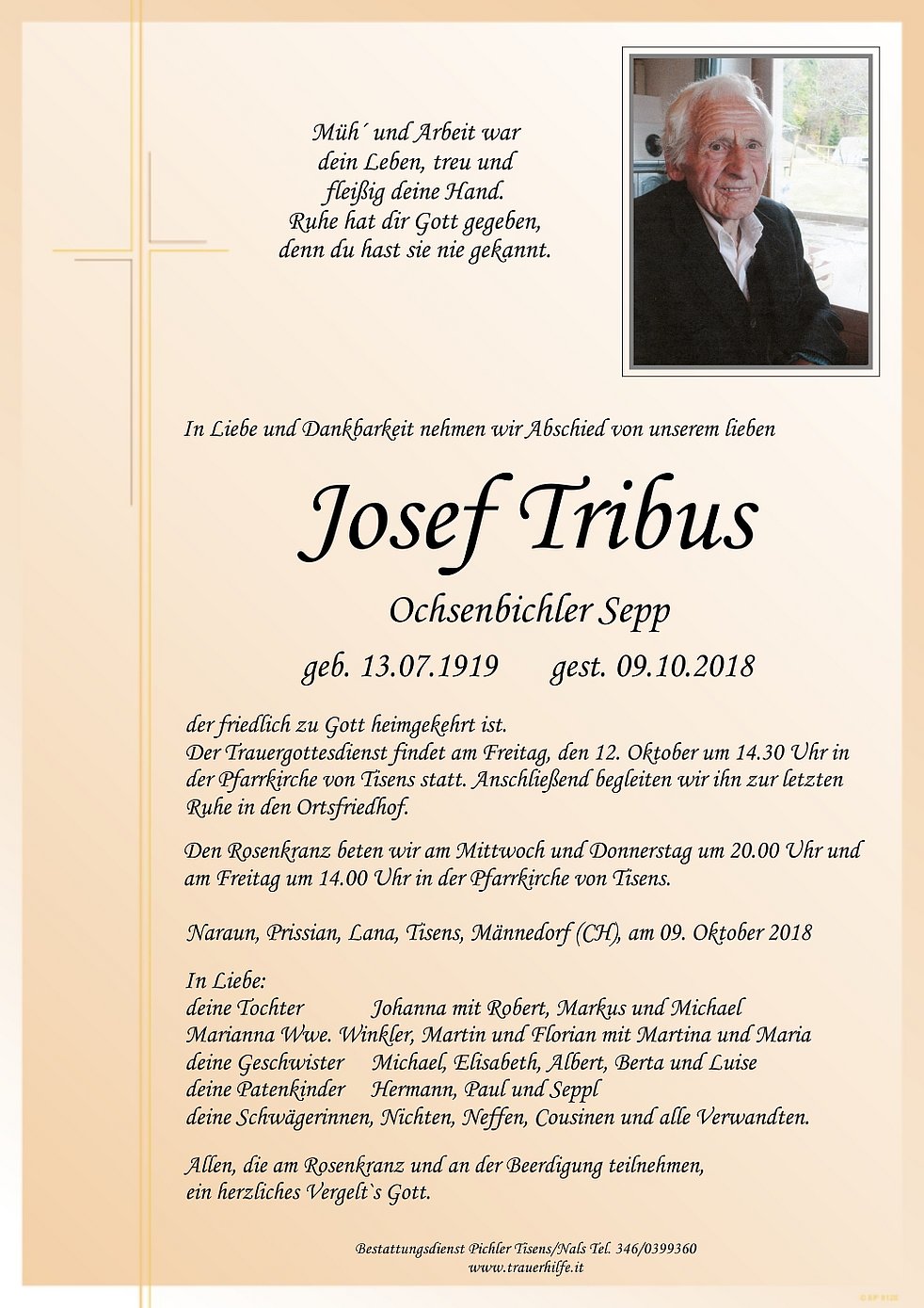 der Pfarrkirche von Tisens statt. Anschließend begleiten wir ihn zur letzten