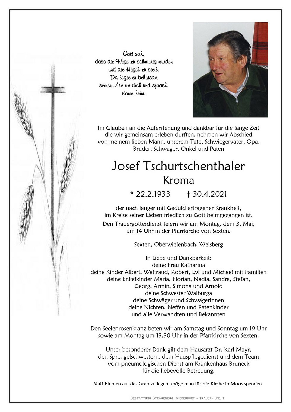 Unser besonderer Dank gilt dem Hausarzt Dr. Karl Mayr, den Sprengelschwestern, dem Hauspflegedienst und dem Team vom pneumologischen Dienst am Krankenhaus Bruneck für die liebevolle Betreuung.