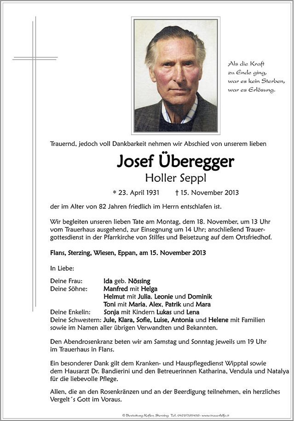 gottesdienst in der Pfarrkirche von Stilfes und Beisetzung auf dem Ortsfriedhof.