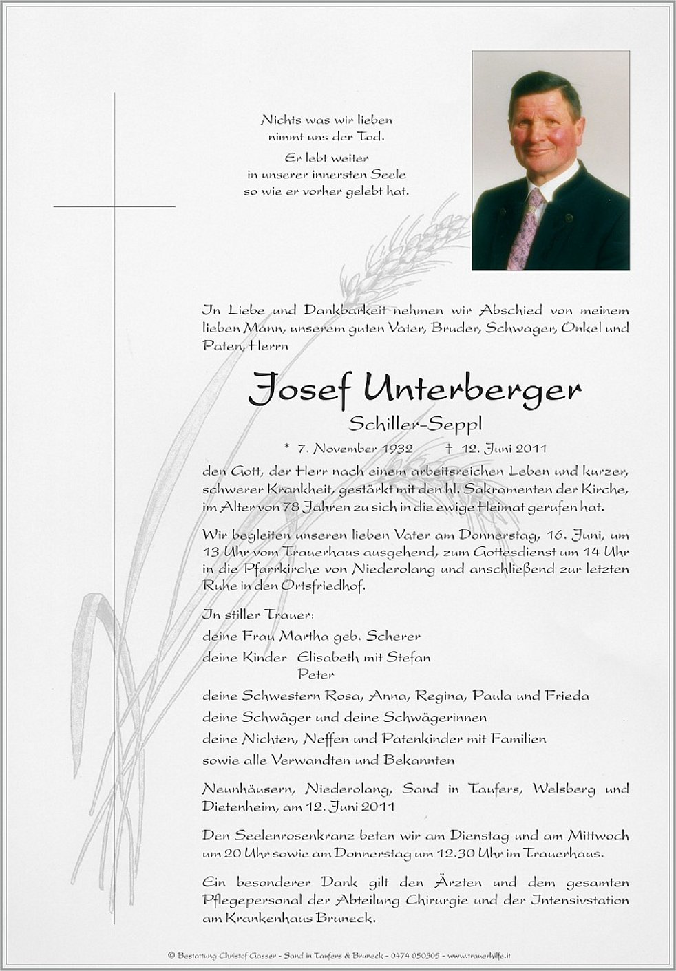 Wir begleiten unseren lieben Vater am Donnerstag, 16. Juni, um 13 Uhr vom Trauerhaus ausgehend, zum Gottesdienst um 14 Uhr in die Pfarrkirche von Niederolang und anschließend zur letzten Ruhe in den Ortsfriedhof.