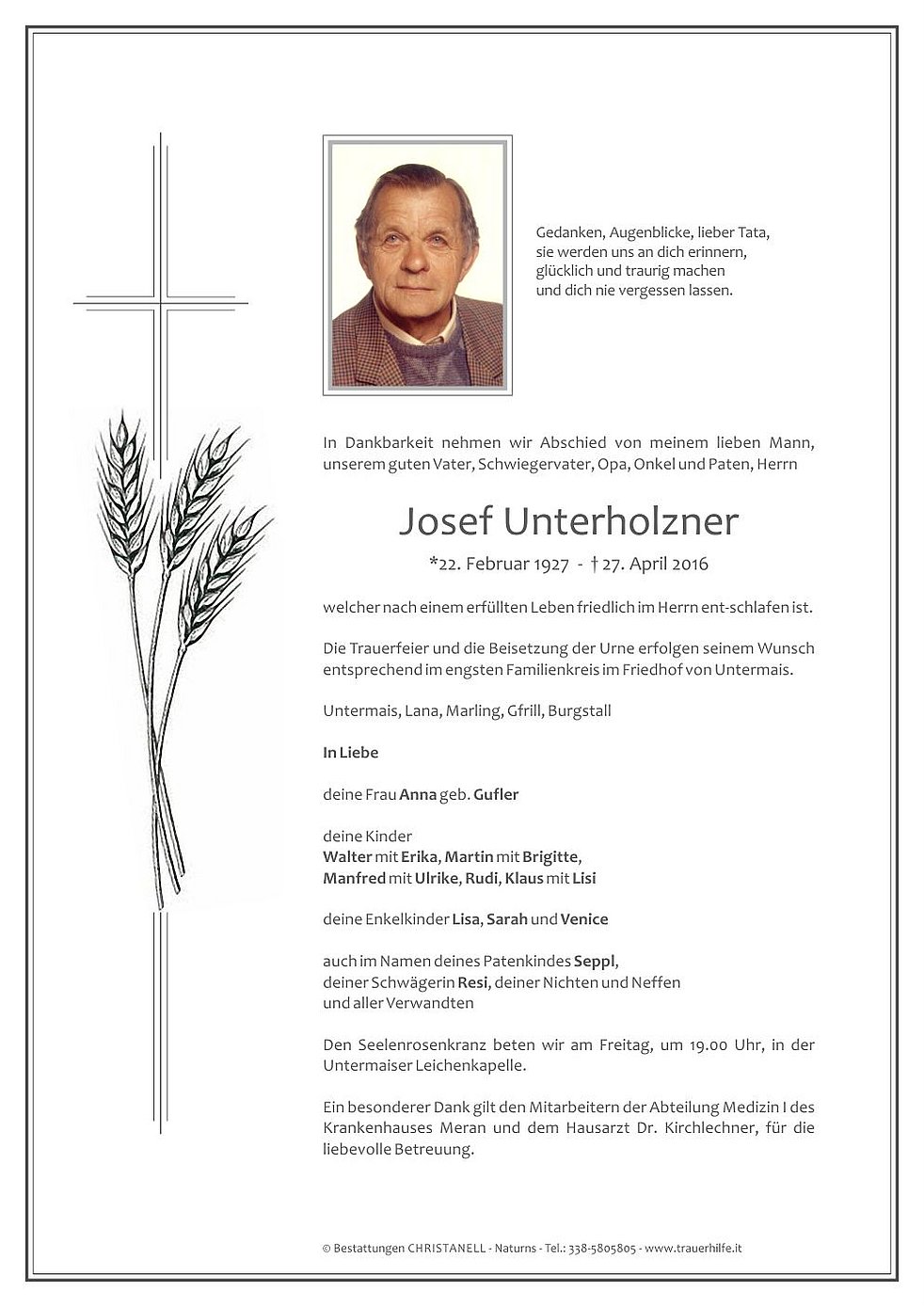 Die Trauerfeier und die Beisetzung der Urne erfolgen seinem Wunsch entsprechend im engsten Familienkreis im Friedhof von Untermais.