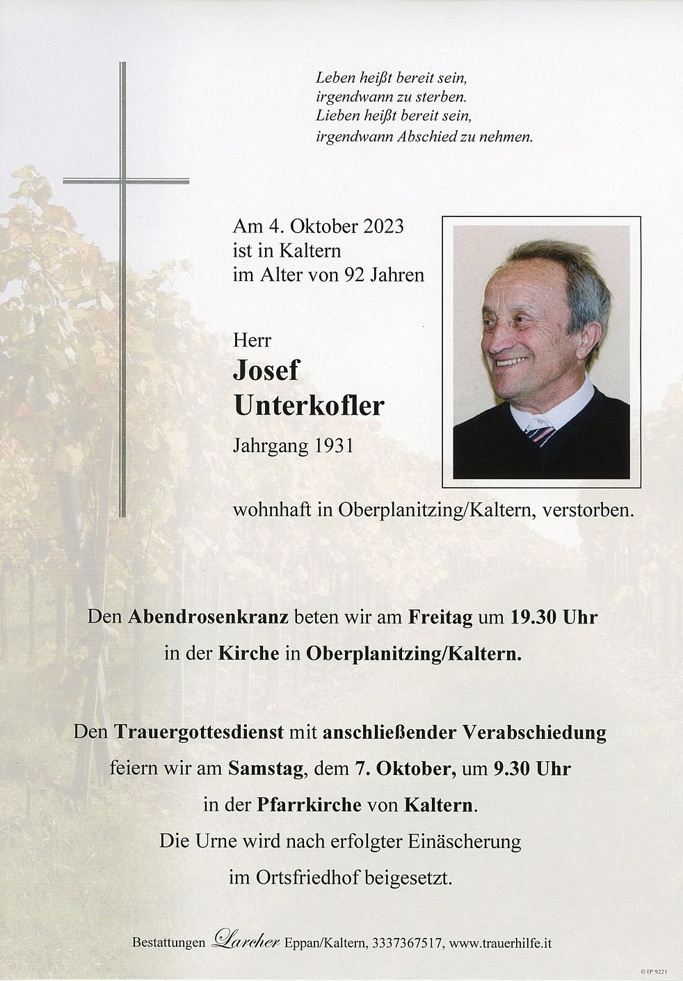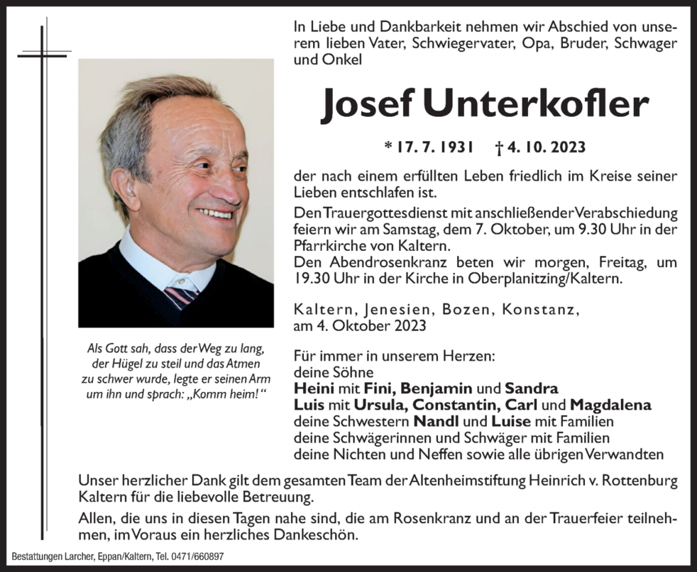 Den Trauergottesdienst mit anschließender Verabschiedung feiern wir am Samstag, dem 7. Oktober um 9.30 Uhr in der Pfarrkirche von Kaltern.