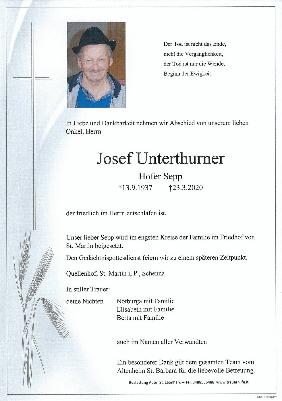 Unser lieber Sepp wird im engsten Kreise der Familie im Friedhof von St. Martin beigesetzt.