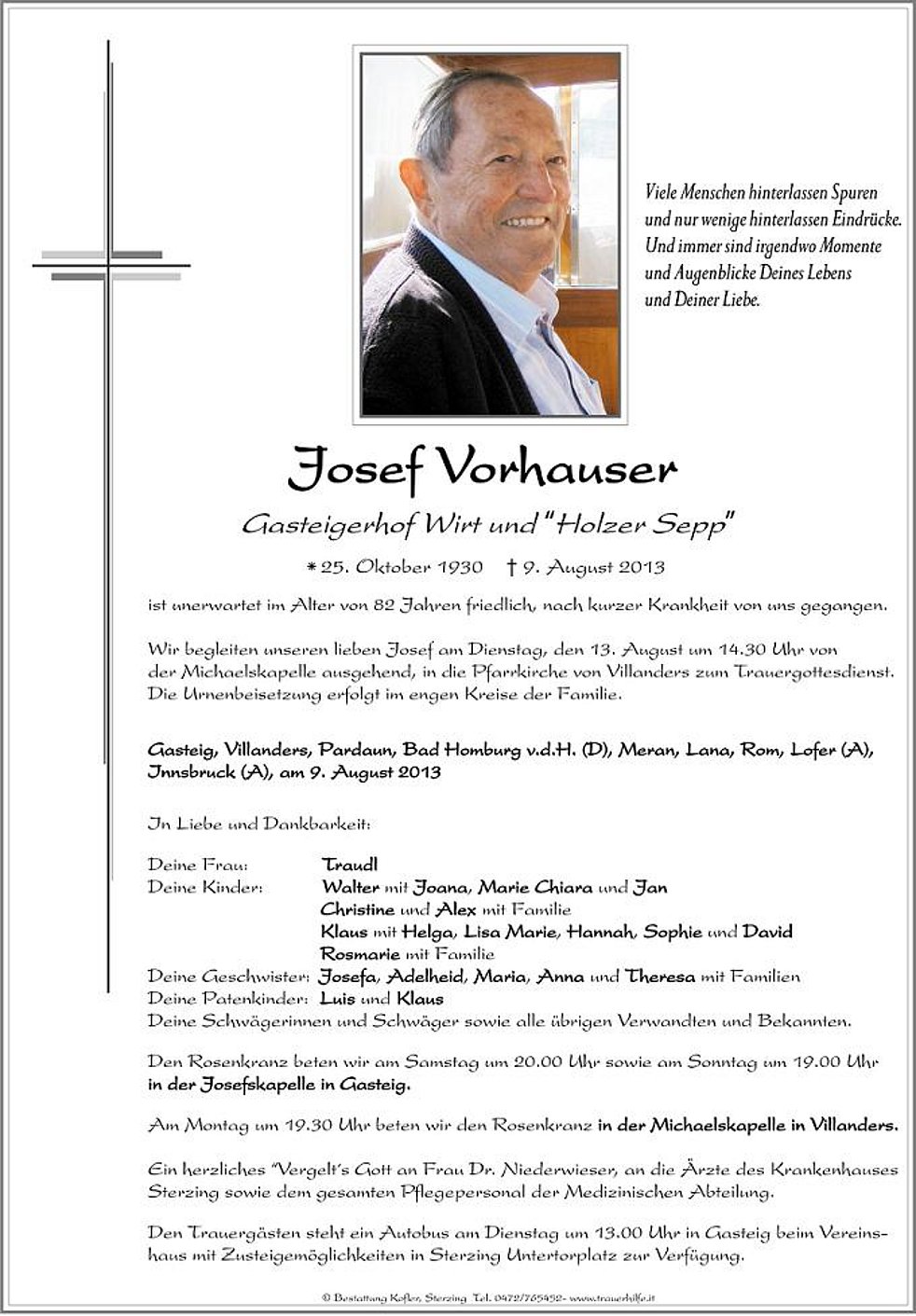 Den Trauergästen steht ein Autobus am Dienstag um 13.00 Uhr in Gasteig beim Vereinshaus mit Zusteigemöglichkeiten in Sterzing Untertorplatz zur Verfügung.