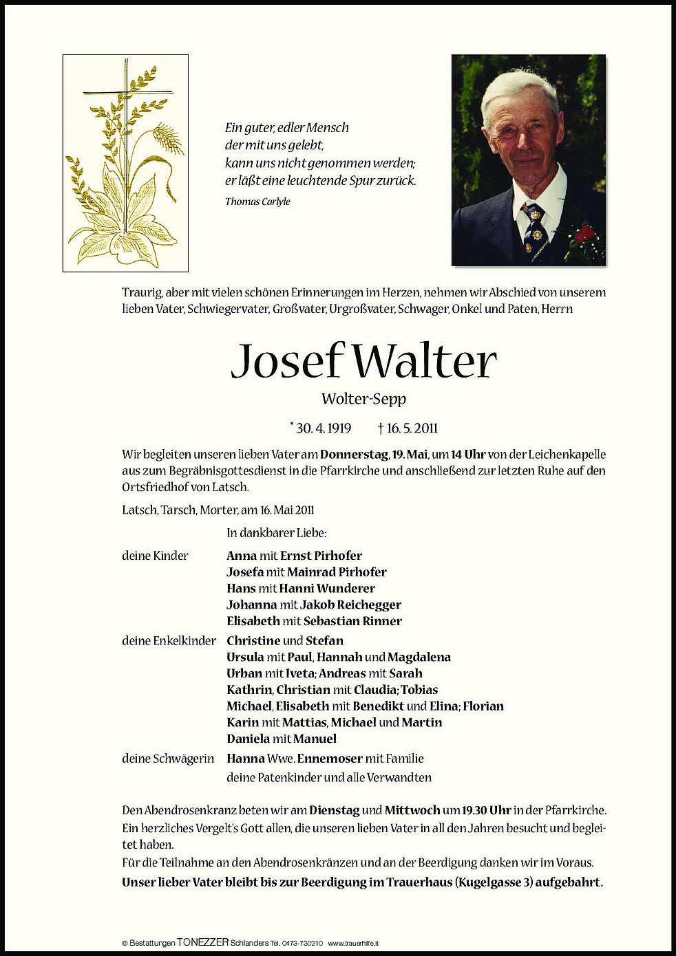 Wir begleiten unseren lieben Vater am Donnerstag, 19. Mai, um 14 Uhr von der Leichenkapelle aus zum Begräbnisgottesdienst in die Pfarrkirche und anschließend zur letzten Ruhe auf den Ortsfriedhof von Latsch.