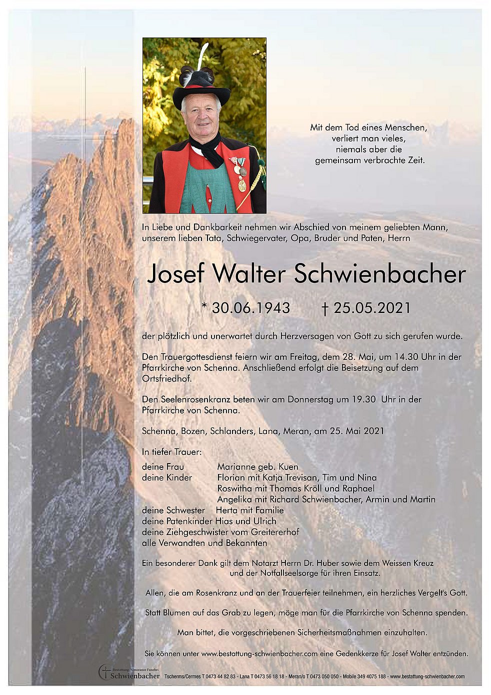 Den Trauergottesdienst feiern wir am Freitag, dem 28. Mai, um 14.30 Uhr in der Pfarrkirche von Schenna. Anschließend erfolgt die Beisetzung auf dem Ortsfriedhof.