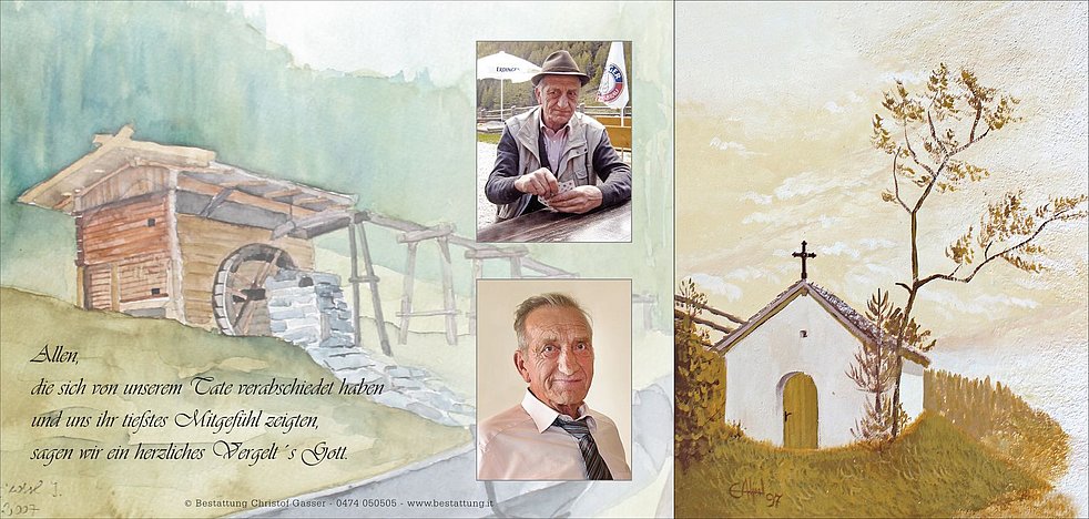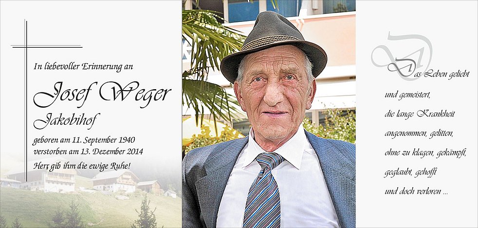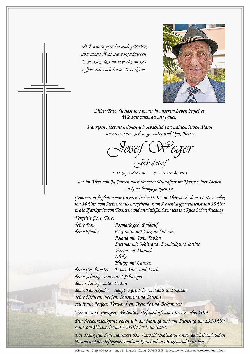Gemeinsam begleiten wir unseren lieben Tate am Mittwoch, dem 17. Dezember, um 14 Uhr vom Heimathaus ausgehend, zum Abschiedsgottesdienst um 15 Uhr in die Pfarrkirche von Terenten und anschließend zur letzten Ruhe in den Friedhof.
