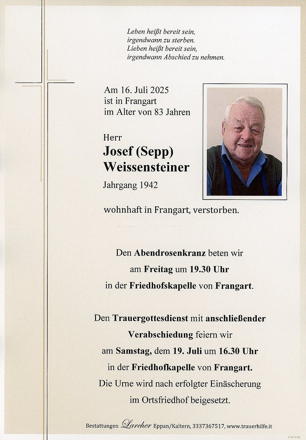 Den Trauergottesdienst mit anschließender Verabschiedung feiern wir am Samstag, dem 19. Juli um 16.30 Uhr in der Friedhofskapelle von Frangart.