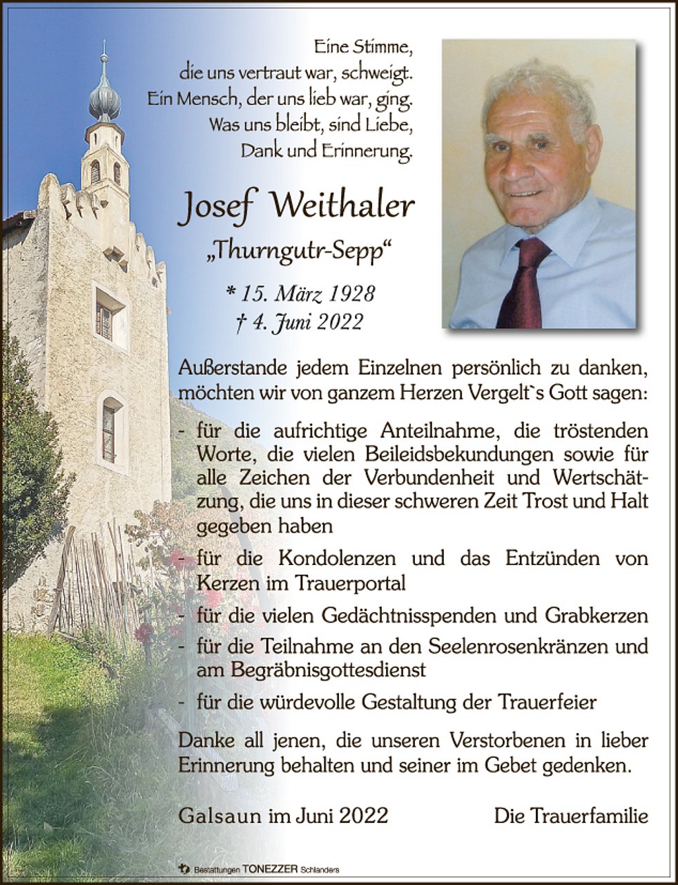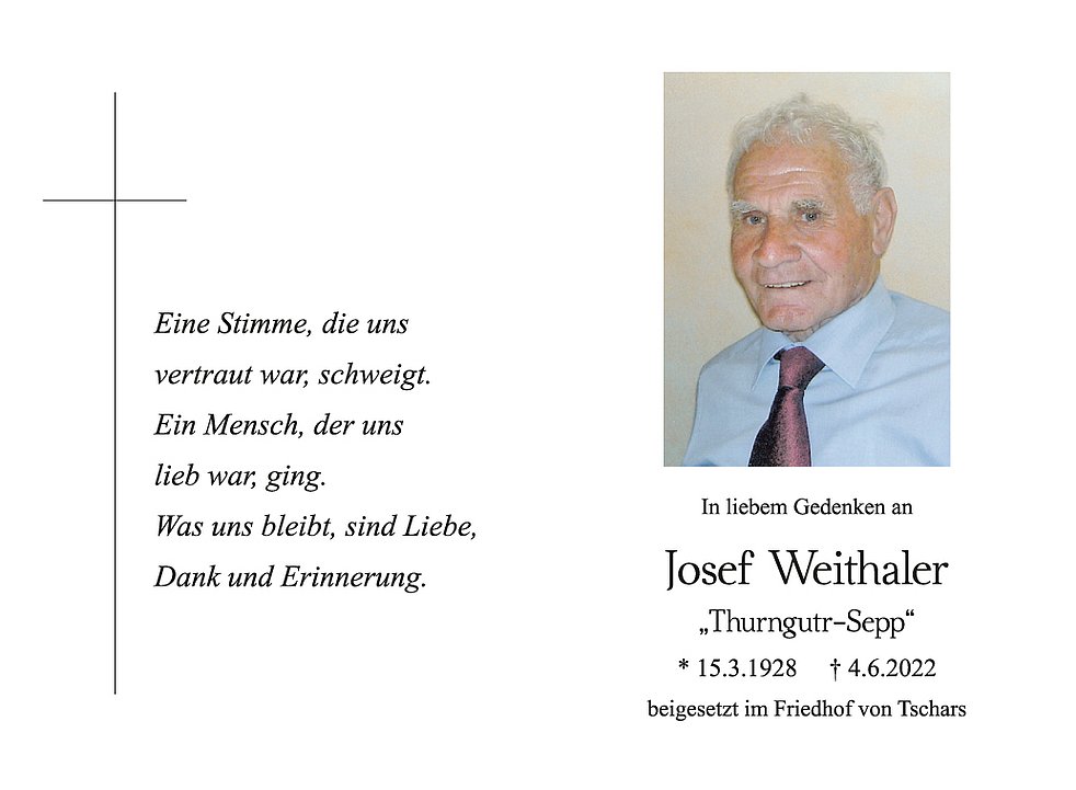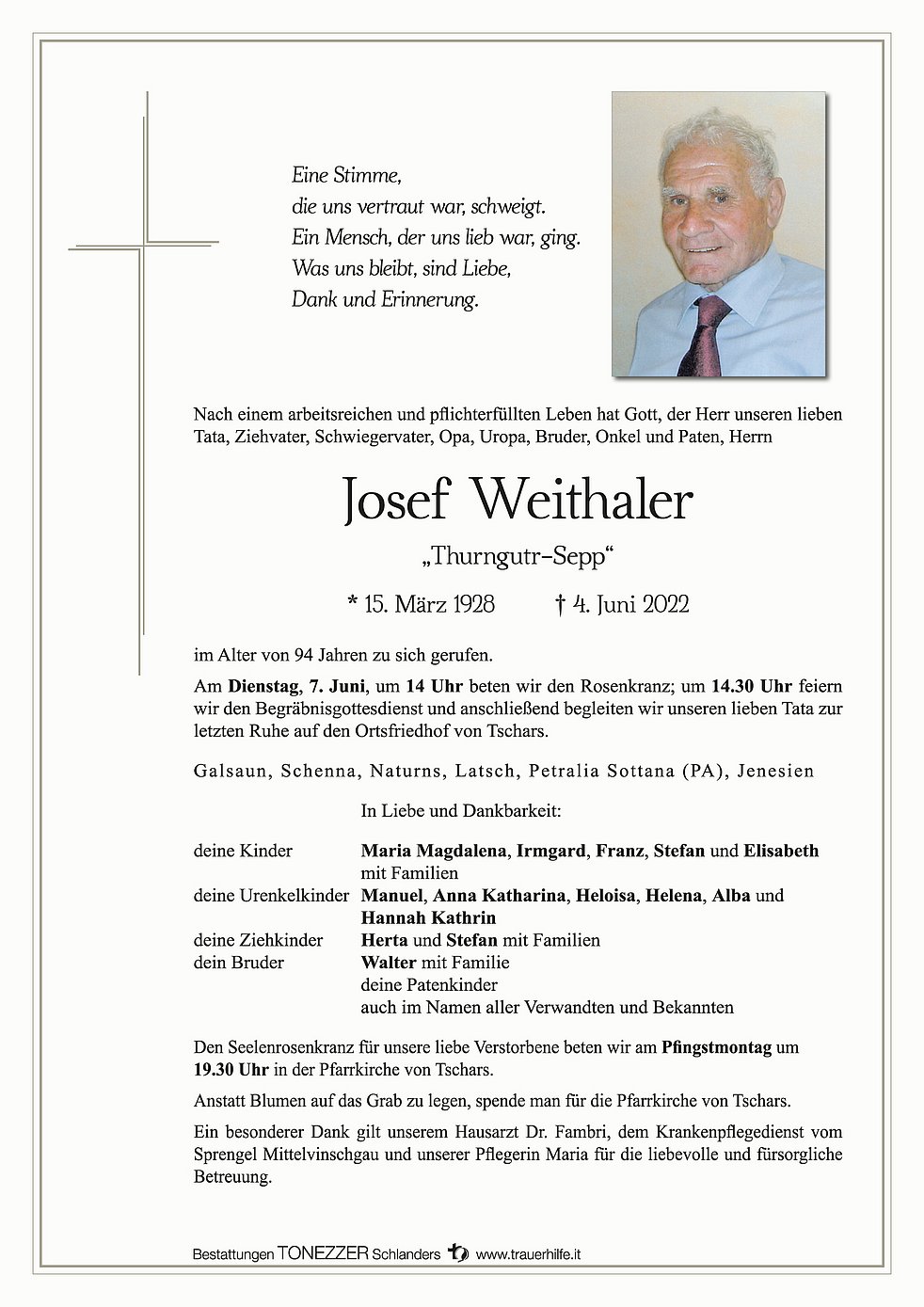 Am Dienstag, 7. Juni, um 14 Uhr beten wir den Rosenkranz; um 14.30 Uhr feiern wir den Begräbnisgottesdienst und anschließend begleiten wir unseren lieben Tata zur letzten Ruhe auf den Ortsfriedhof von Tschars.