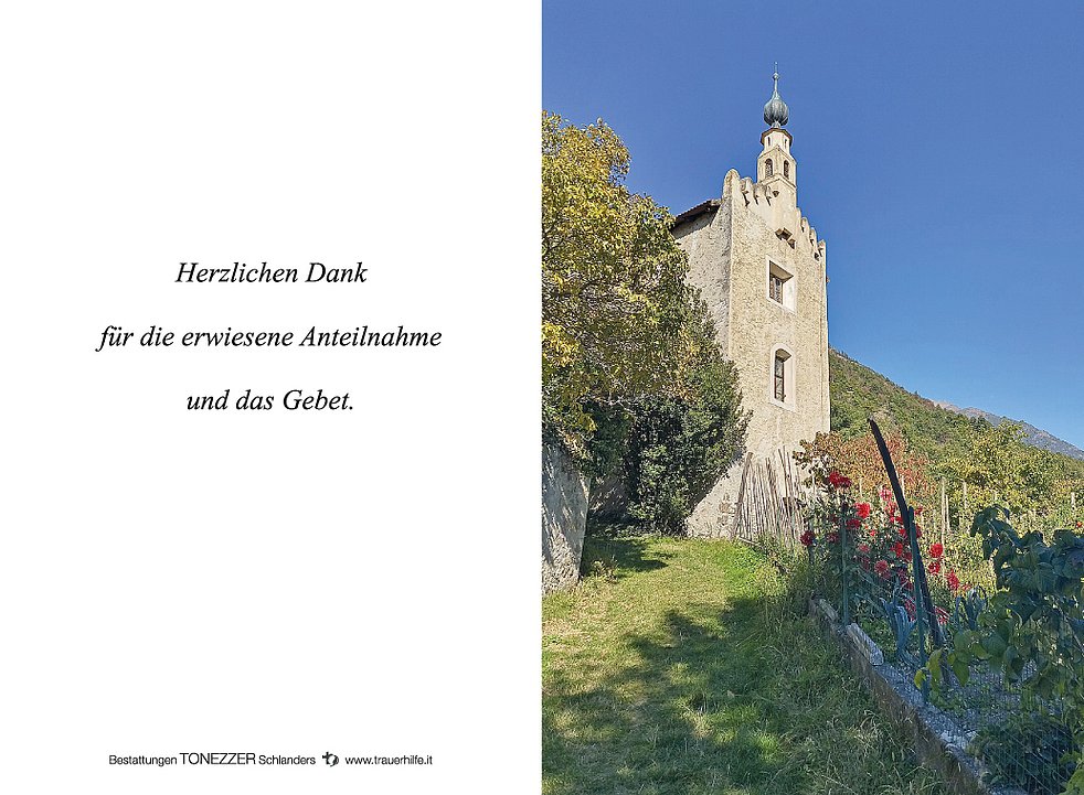 Ein besonderer Dank gilt unserem Hausarzt Dr. Fambri, dem Krankenpflegedienst vom Sprengel Mittelvinschgau und unserer Pflegerin Maria für die liebevolle und fürsorgliche Betreuung.