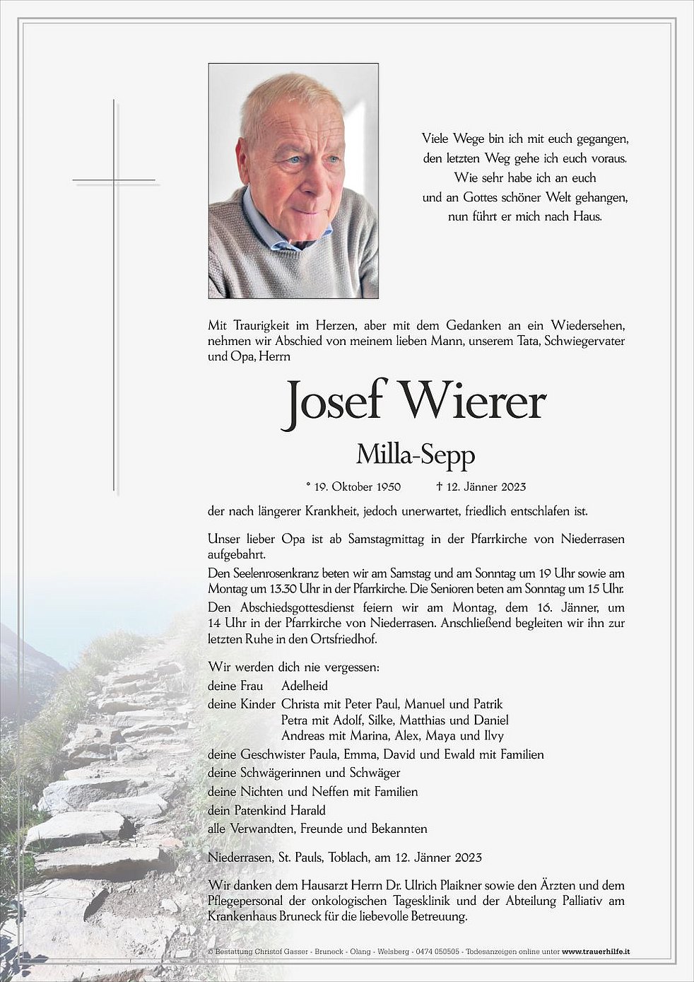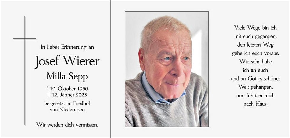 Den Abschiedsgottesdienst feiern wir am Montag, dem 16. Jänner, um 14 Uhr in der Pfarrkirche von Niederrasen. Anschließend begleiten wir ihn zur letzten Ruhe in den Ortsfriedhof.