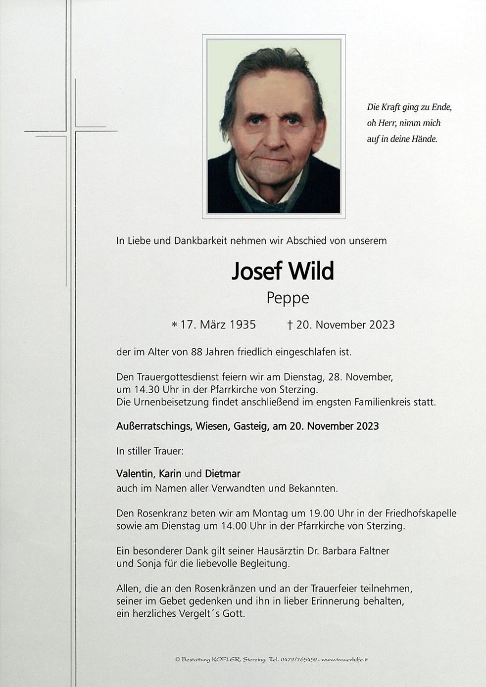 Den Trauergottesdienst feiern wir am Dienstag, 28. November, um 14.30 Uhr in der Pfarrkirche von Sterzing. Die Urnenbeisetzung findet anschließend im engsten Familienkreis statt.