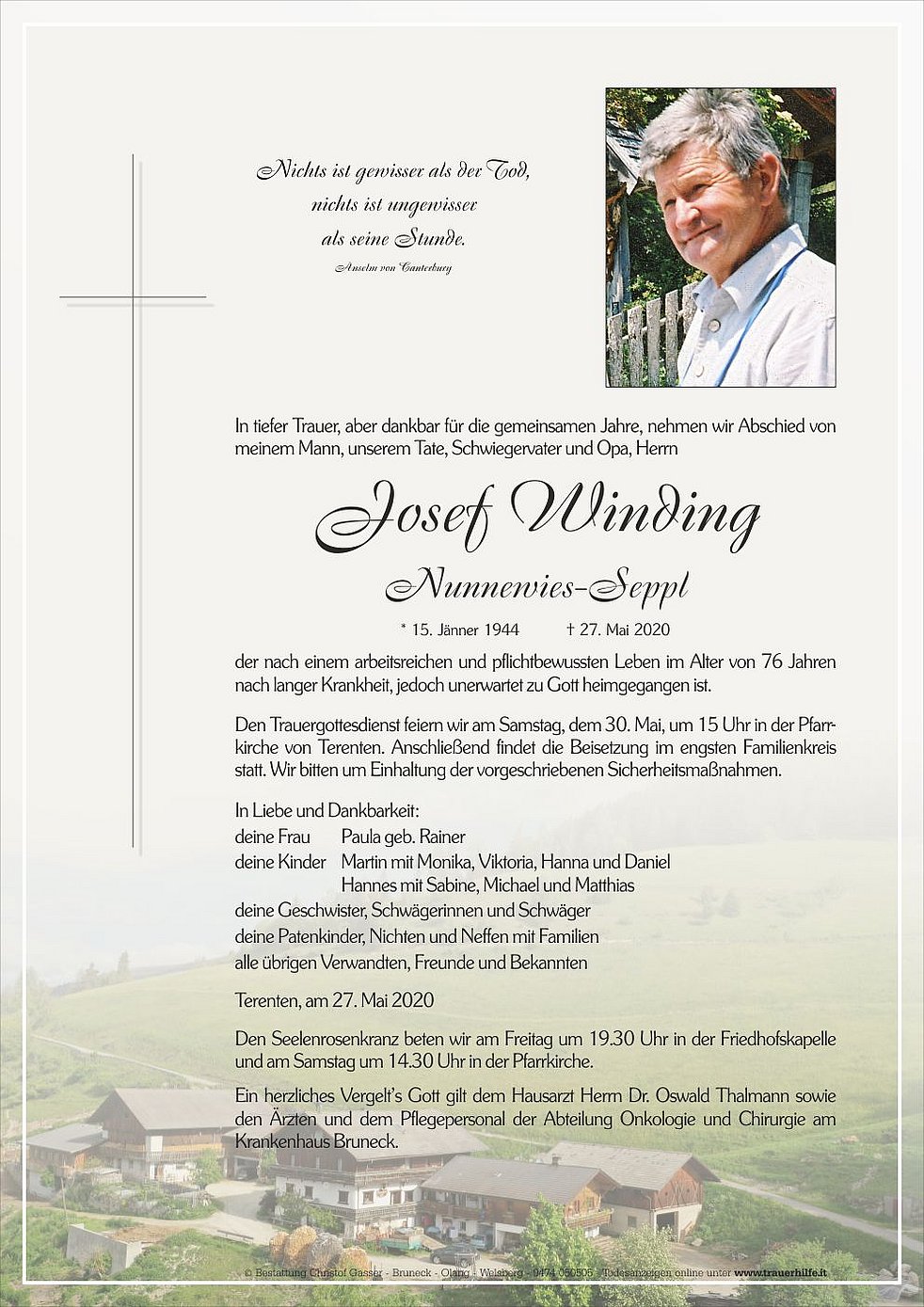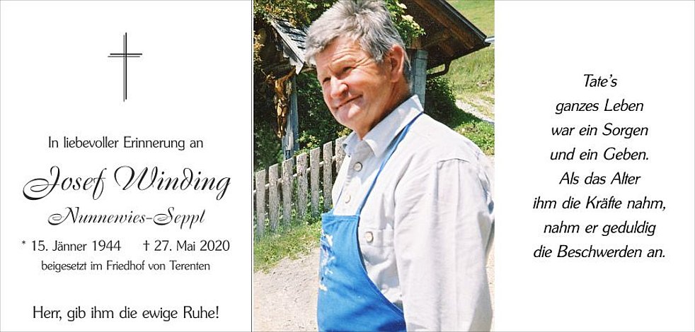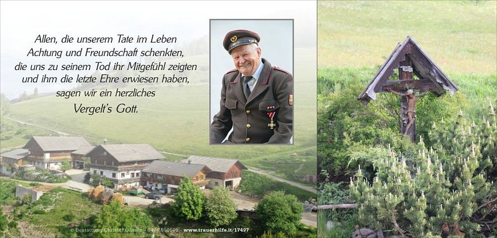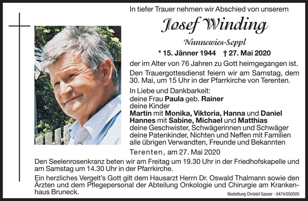 Den Trauergottesdienst feiern wir am Samstag, dem 30. Mai, um 15 Uhr in der Pfarr-kirche von Terenten. Anschließend findet die Beisetzung im engsten Familienkreis statt. Wir bitten um Einhaltung der vorgeschriebenen Sicherheitsmaßnahmen.