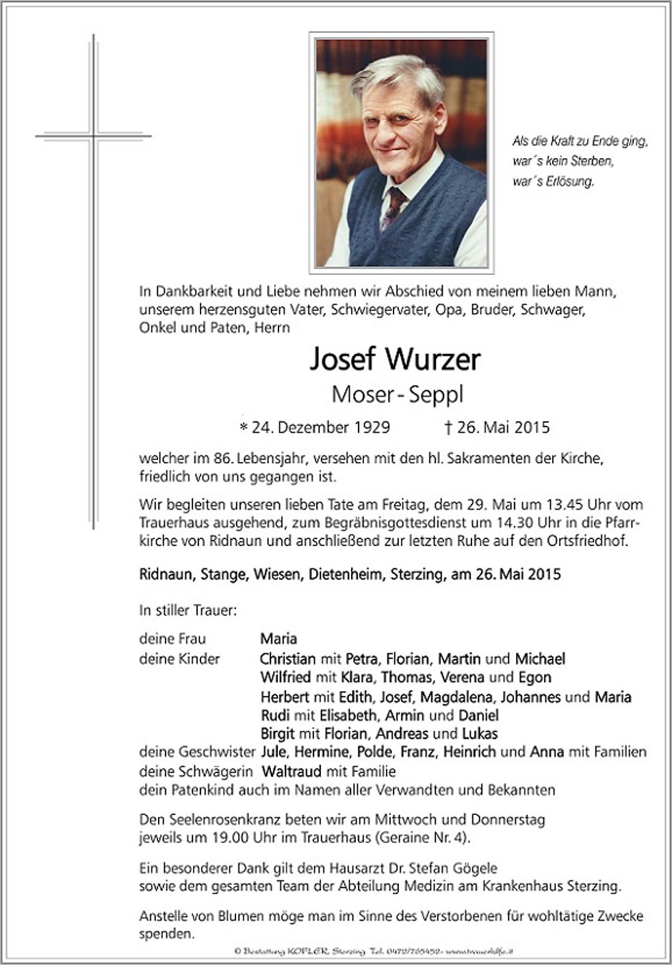welcher im 86. Lebensjahr, versehen mit den hl. Sakramenten der Kirche,