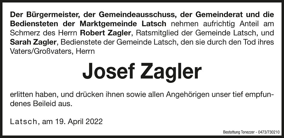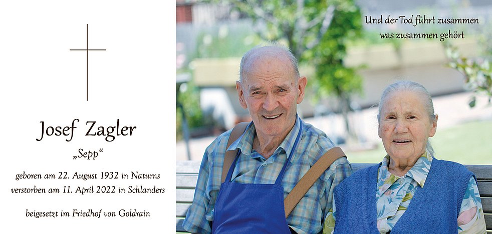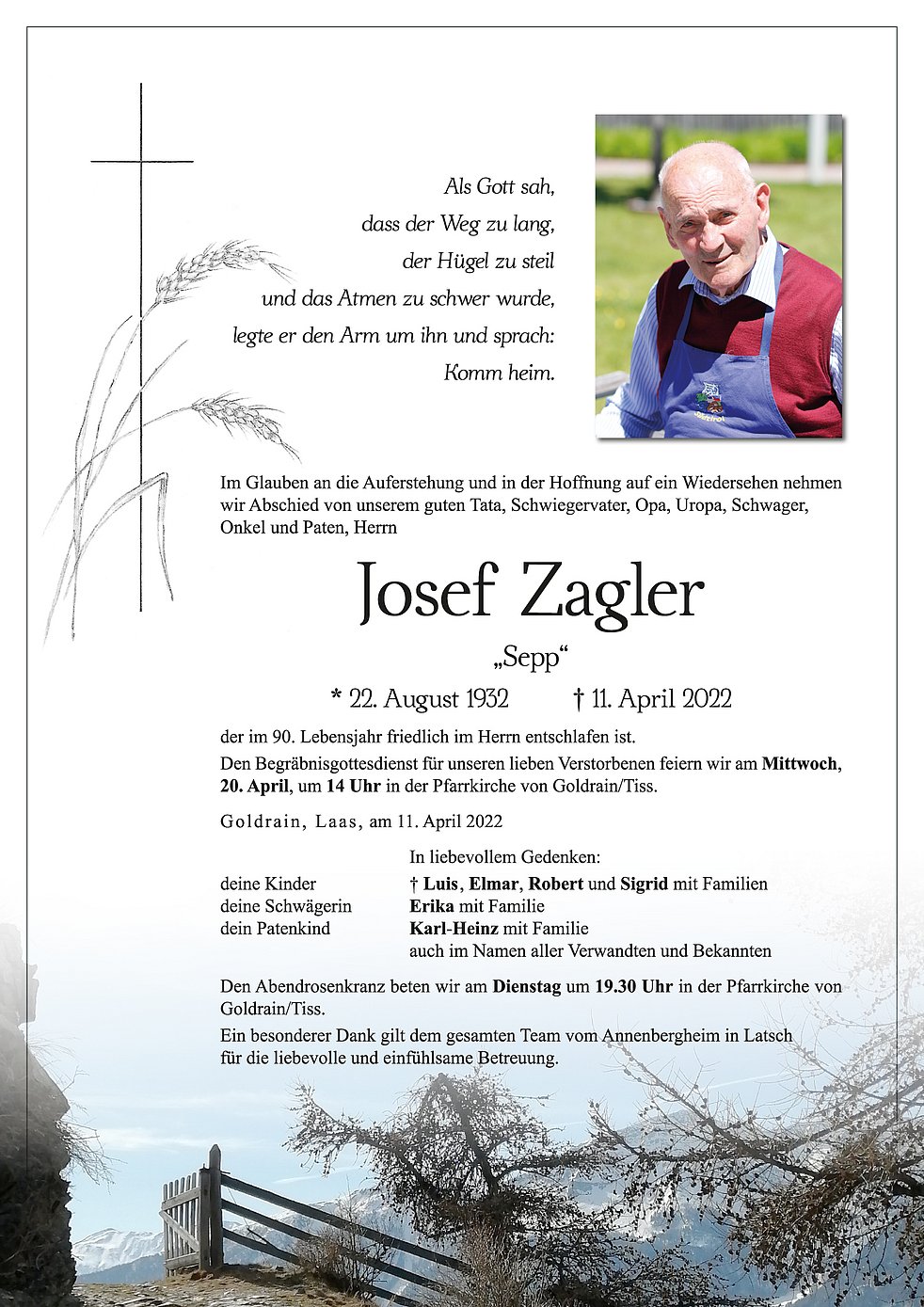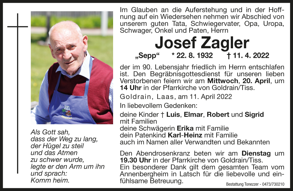 Den Begräbnisgottesdienst für unseren lieben Verstorbenen feiern wir am Mittwoch, 20. April, um 14 Uhr in der Pfarrkirche von Goldrain/Tiss.