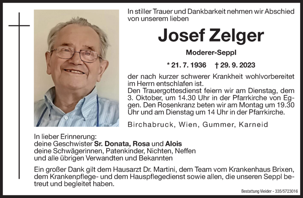 Ein großer Dank gilt dem Hausarzt Dr. Martini, dem Team vom Krankenhaus Brixen, dem Krankenpflege- und dem Hauspflegedienst sowie allen, die unseren Seppl betreut und begleitet haben.