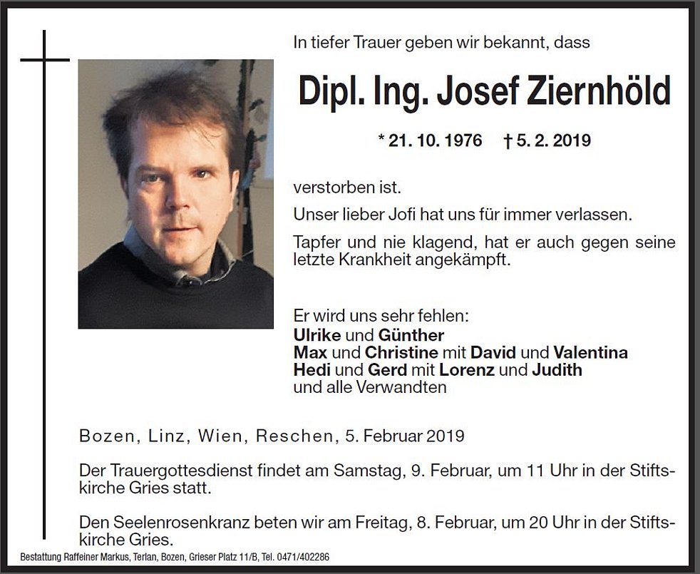 Der Trauergottesdienst findet am Samstag, 9. Februar um 11 Uhr in der Stiftskirche Gries statt.