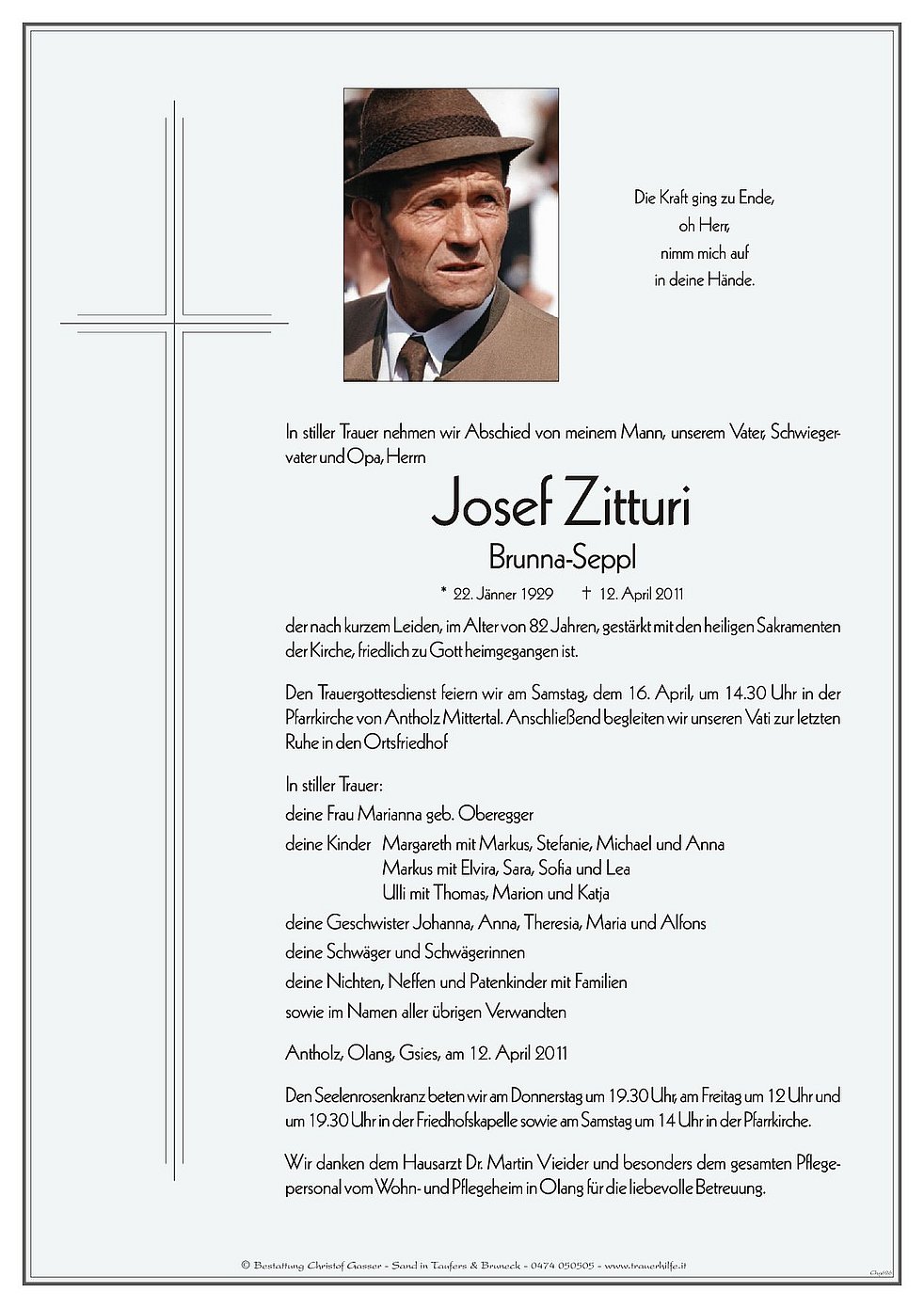 Den Trauergottesdienst feiern wir am Samstag, dem 16. April, um 14.30 Uhr in der Pfarrkirche von Antholz Mittertal. Anschließend begleiten wir unseren Vati zur letzten Ruhe in den Ortsfriedhof