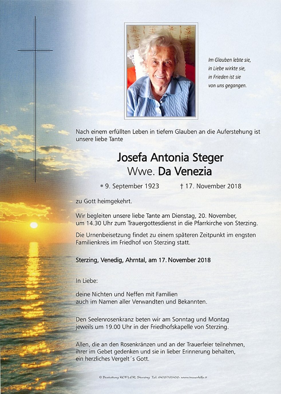 Wir begleiten unsere liebe Tante am Dienstag, 20. November, um 14.30 Uhr zum Trauergottesdienst in die Pfarrkirche von Sterzing. Die Urnenbeisetzung findet zu einem späteren Zeitpunkt im engsten Familienkreis im Friedhof von Sterzing statt.