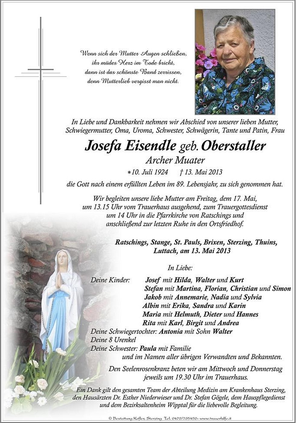 Wir begleiten unsere liebe Mutter am Freitag, dem 17. Mai, um 13.15 Uhr