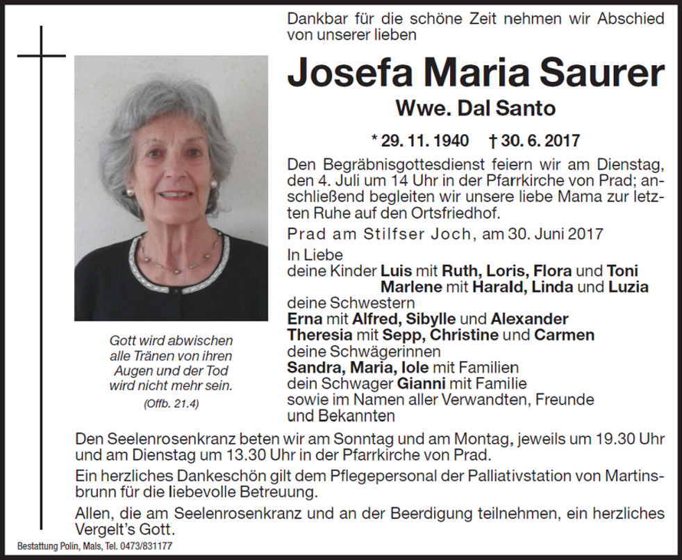 Den Begräbnisgottesdienst feiern wir am Dienstag, den 04. Juli um 14.00 Uhr