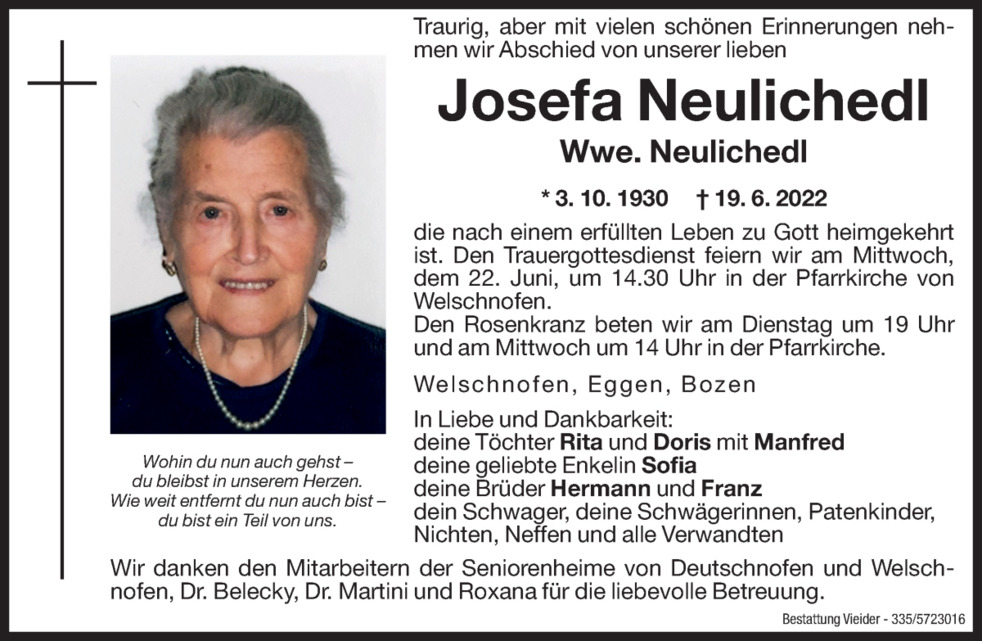 Den Trauergottesdienst feiern wir am Mittwoch, dem 22. Juni, um 14.30 Uhr in der Pfarrkirche von Welschnofen.