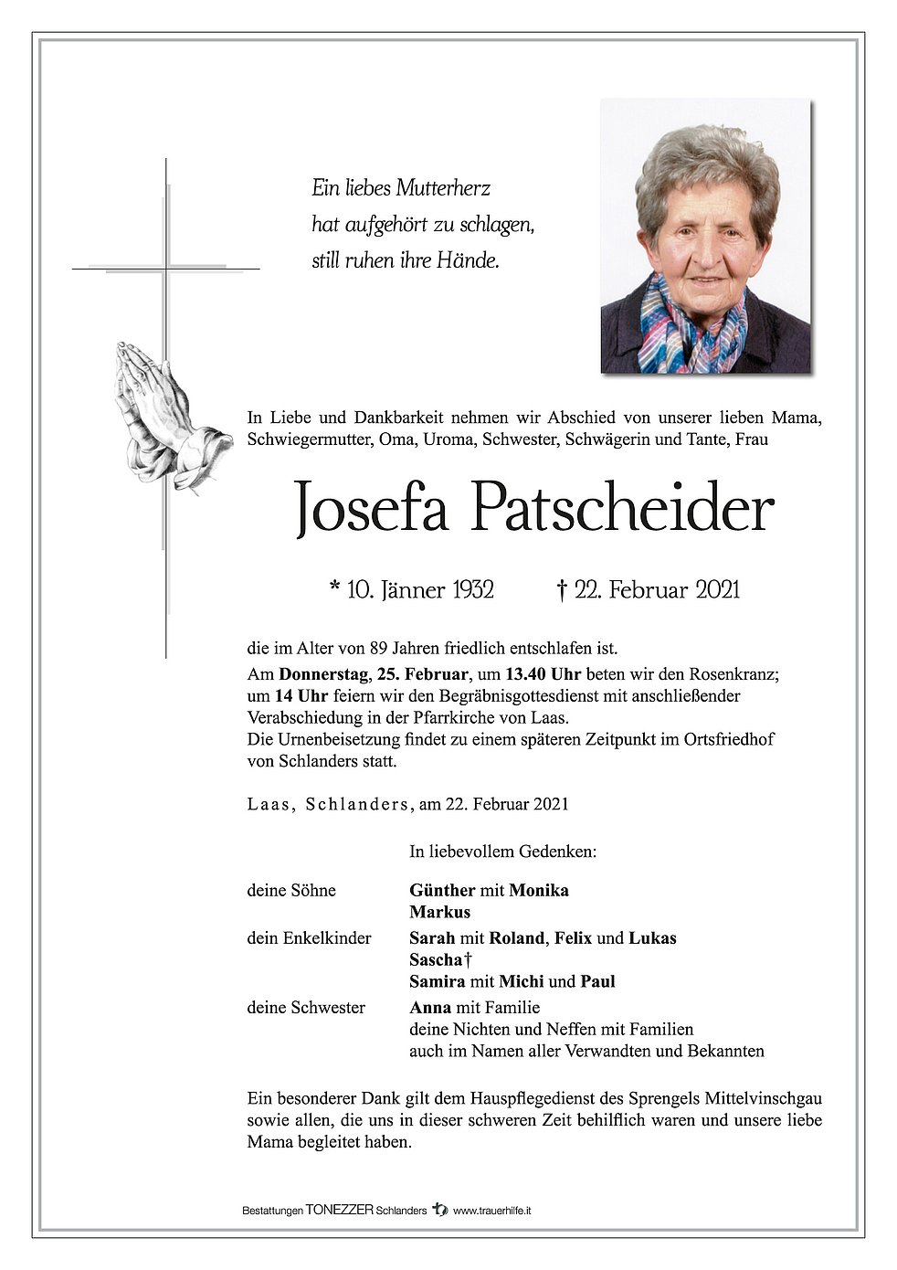 Am Donnerstag, 25. Februar, um 13.40 Uhr beten wir den Rosenkranz; um 14 Uhr feiern wir den Begräbnisgottesdienst mit anschließender Verabschiedung in der Pfarrkirche von Laas.
