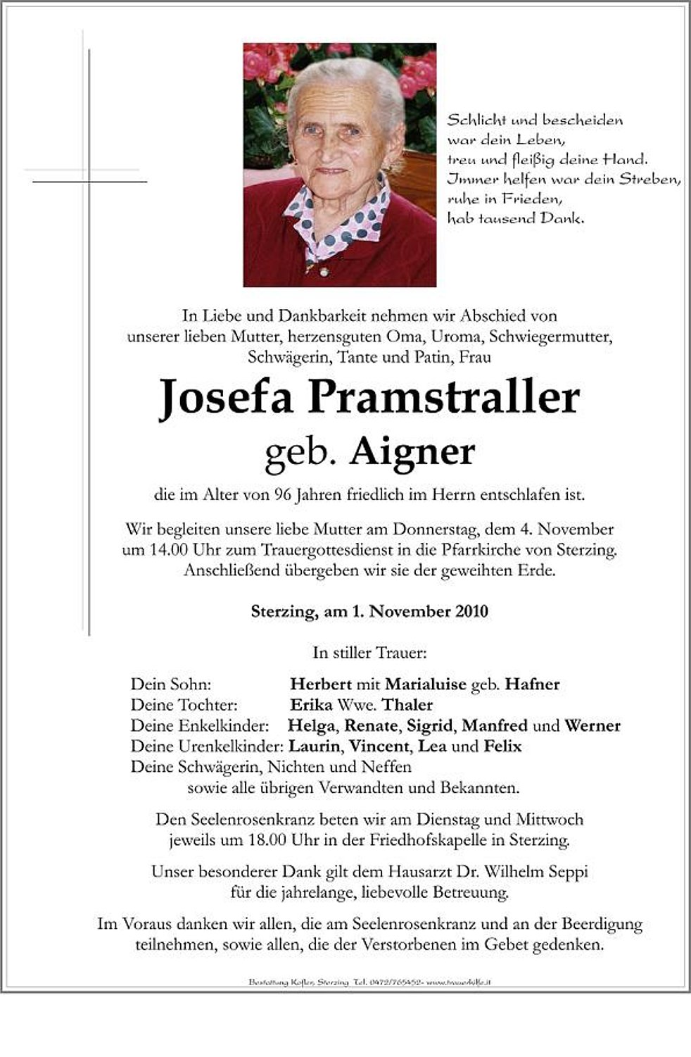 Wir begleiten unsere liebe Mutter am Donnerstag, dem 4. November um 14.00 Uhr zum Trauergottesdienst in die Pfarrkirche von Sterzing. Anschließend übergeben wir sie der geweihten Erde.