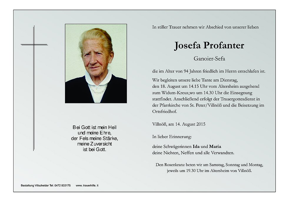 den 18. August um 14.15 Uhr vom Altersheim ausgehend zum Widum-Kreuz,wo um 14.30 Uhr die Einsegnung stattfindet. Anschließend erfolgt der Trauergottesdienst in der Pfarrkirche von St. Peter/Villnöß und die Beisetzung im Ortsfriedhof.