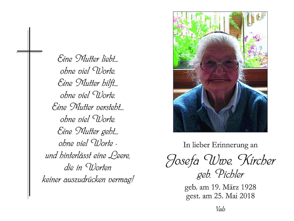Ein besonderer Dank gilt der Hausärztin Dr. Caroline Tröbinger und dem gesamten Pflegeteam vom Hartmannsheim Brixen für die liebevolle Betreuung, sowie allen, die an den Rosenkränzen und der Beerdigung teilnehmen.
