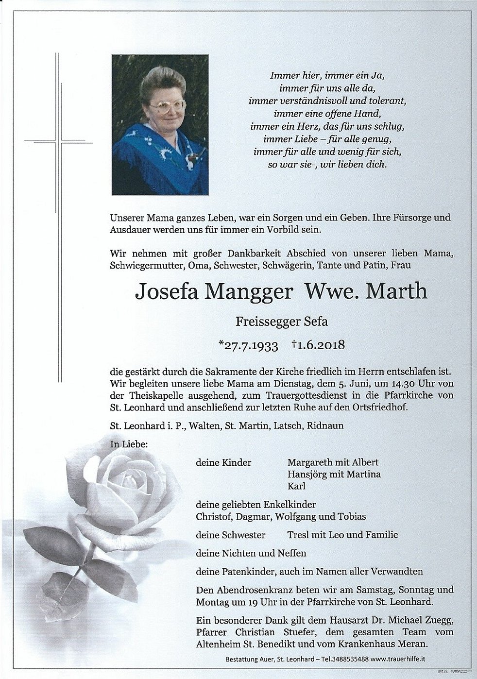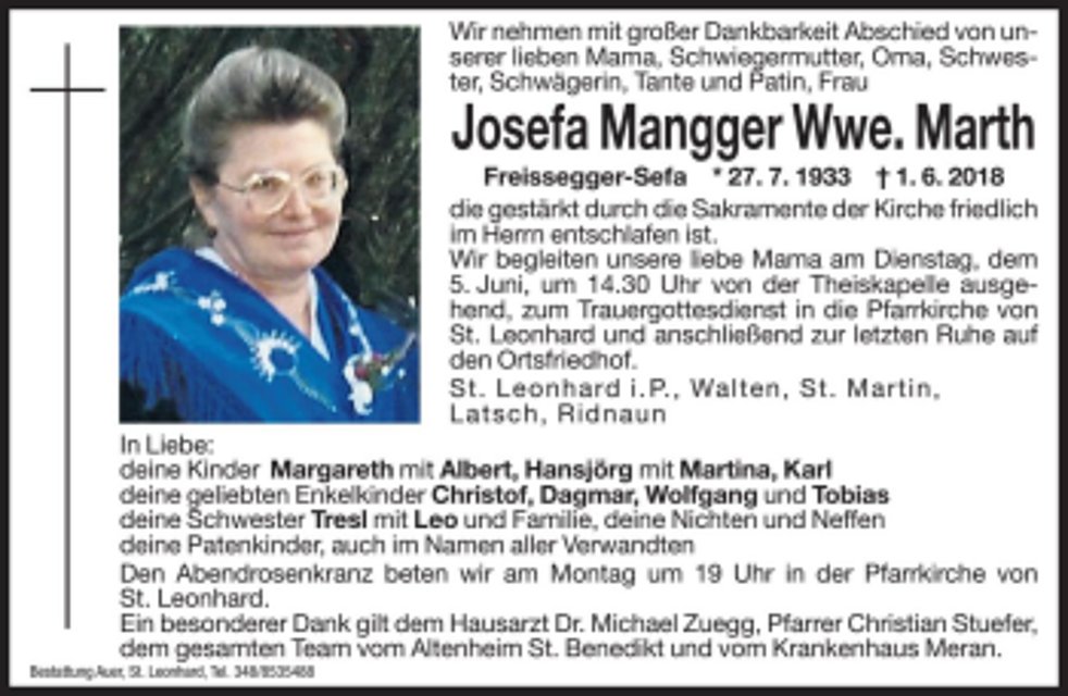 Wir begleiten unsere liebe Mama am Dienstag, dem 5. Juni, um 14.30 Uhr von der Theiskapelle ausgehend, zum Trauergottesdienst in die Pfarrkirche von St. Leonhard und anschließend zur letzten Ruhe auf den Ortsfriedhof.