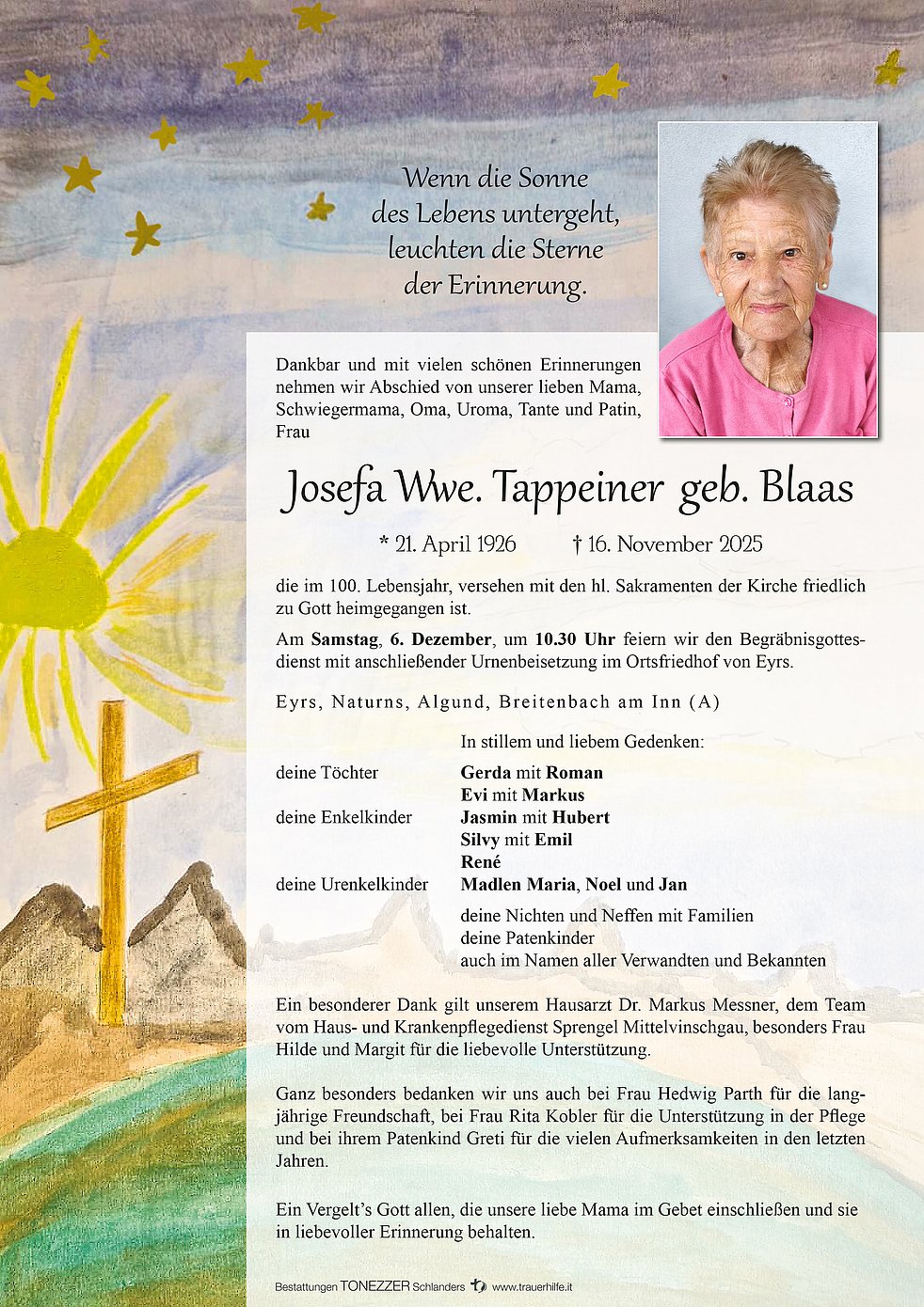 Liebe Loretzer Seffa,wia ma sie im Dorf kennt hot.Eine gute Seele, welche am 16.November das Lebensbuch geschlossen hat.Es blieb ihr im Leben nichts verschont, Höhen... Tiefen... gute und schlechte Zeiten.Aber das Gute über-wiegt, beim Loretzhof 3 wurde vielen geholfen.Als junger Bua hab ich immer in Erinnerung,das an jeden Samstag Nachmittag in der untern Goss (Bahnhofstraße) geputzt wurde.Angefangen beim "Hitl Adolf" die Tresl,weiter ban "Binder Norbert" vorn Lodn die Linda,weiter ban Loretzer die Seffa,in longen Hausgong,vor der Haustür in Staffel aus Stoan und die Goss. Die zwoa Madln Gerda und bsunders die Evi mit Familie und die Nochbern hobn guat af der Mama Seffa gschaug.Ruhe nun in Frieden.Pfiati Loretzer Seffa.