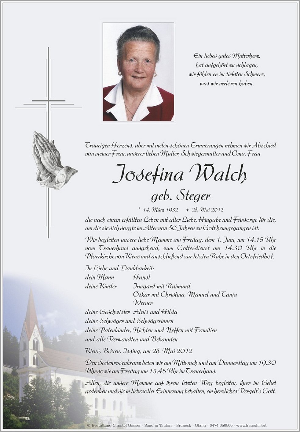 Wir begleiten unsere liebe Mamme am Freitag, dem 1. Juni, um 14.15 Uhr vom Trauerhaus ausgehend, zum Gottesdienst um 14.30 Uhr in die Pfarrkirche von Kiens und anschließend zur letzten Ruhe in den Ortsfriedhof.