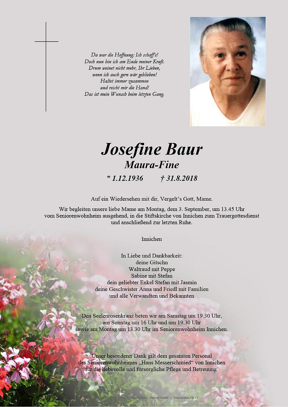Wir begleiten unsere liebe Mame am Montag, dem 3. September, um 13.45 Uhr vom Seniorenwohnheim ausgehend, in die Stiftskirche von Innichen zum Trauergottesdienst und anschließend zur letzten Ruhe.