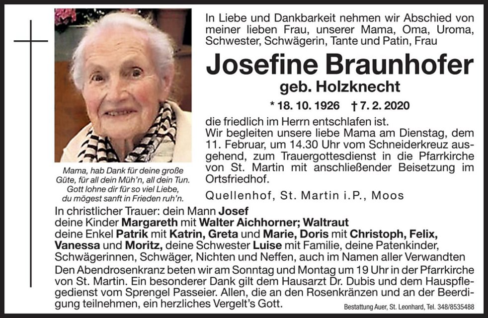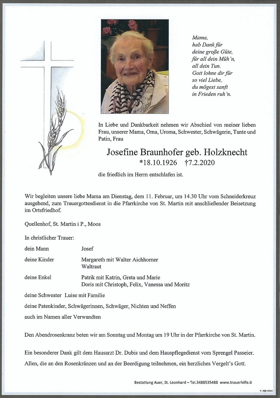 Wir begleiten unsere liebe Mama am Dienstag, dem 11. Februar, um 14.30 Uhr vom Schneiderkreuz ausgehend, zum Trauergottesdienst in die Pfarrkirche von St. Martin mit anschließender Beisetzung im Ortsfriedhof.