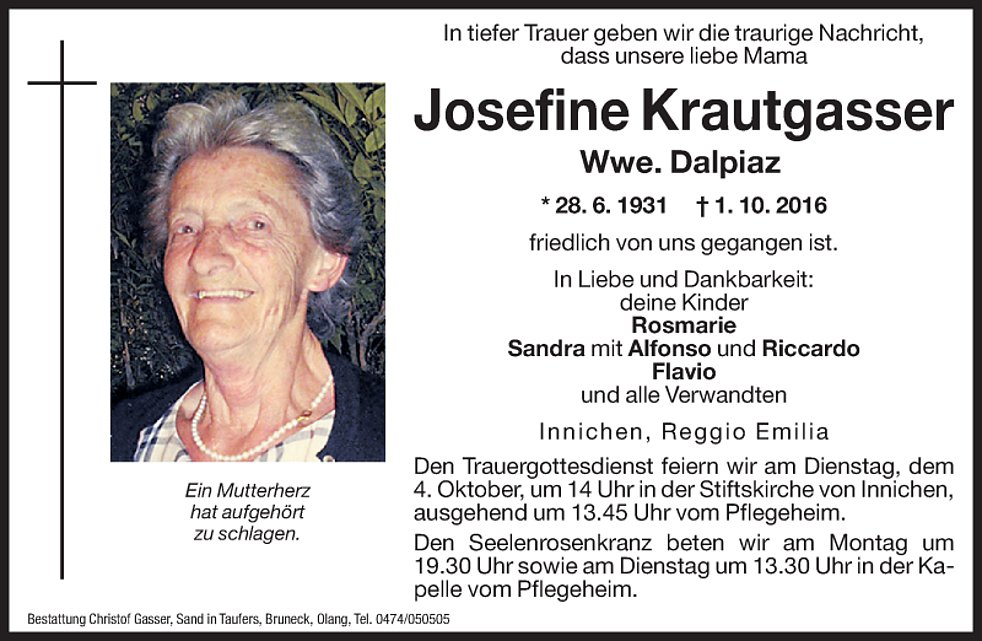 Den Trauergottesdienst feiern wir am Dienstag, dem 4. Oktober, um 14 Uhr in der Stiftskirche von Innichen, ausgehend um 13.45 Uhr vom Pflegeheim.