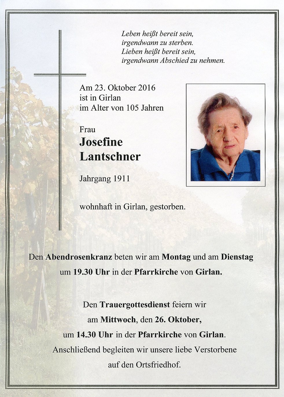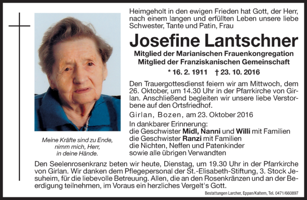 Den Trauergottesdienst feiern wir am Mittwoch, den 26. Oktober um 14.30 Uhr in der Pfarrkirche von Girlan. Anschließend begleiten wir unsere liebe Verstorbene auf den Ortsfriedhof.