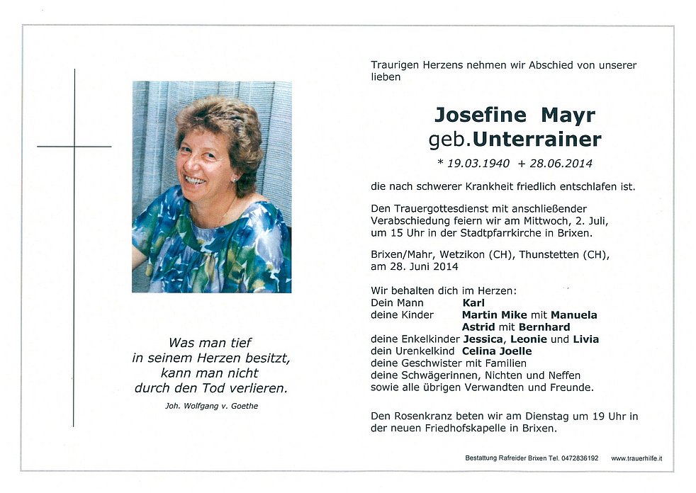 Ich werde dich Josi immer im Herzen halten, bin dir dankbar für alles was du auch für meine Mutter getan hast. Dort wo Du jetzt bist, wirst Du sie antreffen, und ihr könnt zusammen lachen und auf uns schauen....