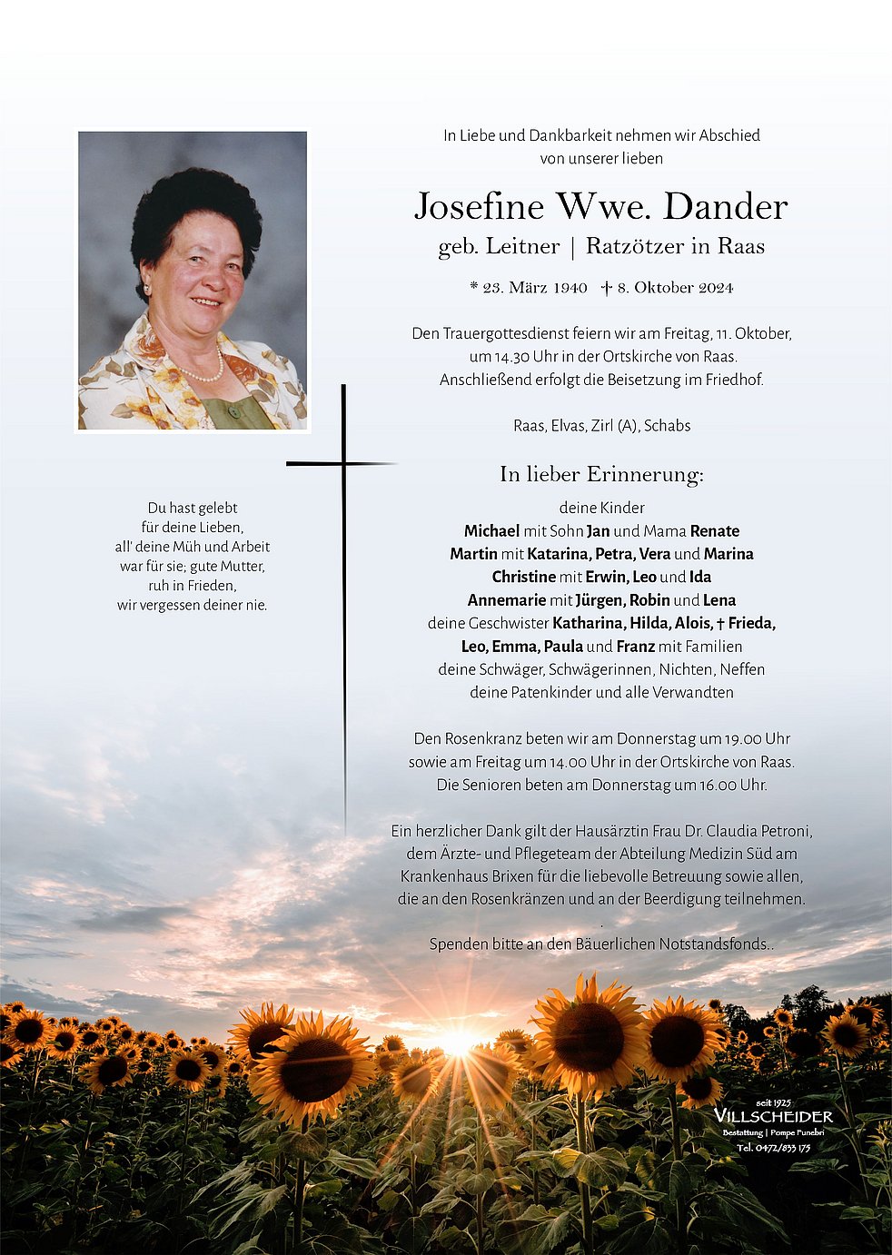 Liebe Annemarie,und Angehörige.Helmut und ich, möchten unser Beileid aussprechen.Eine Mutter verlieren schmerzt unbeschreiblich,aber leider kommt irgendwann die Zeit wo man Abschied nehmen muss.Eure Mutter war sehr eine angenehme Frau,habe öfters mit ihr gelacht,und so ein paar Rascherlen gemacht.Wir werden sie in guter Erinnerung behalten,und jetzt, Ruhe in Frieden liebe Josefine Helmut mit Marlene