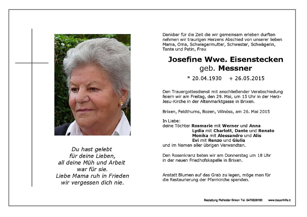 Ein besonderer Dank gilt dem gesamten Pflegepersonal des 3. Wohnbereich des Bürgerheimes sowie dem Hausarzt Dr. Walter Niederstätter und an Frau Anna für die liebevolle Betreuung und Begleitung.