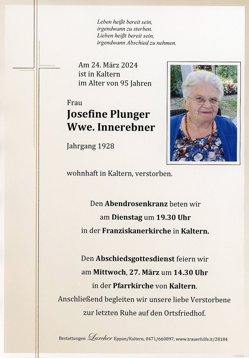 Den Abschiedsgottesdienst feiern wir am Mittwoch, dem 27. März um 14.30 Uhr in der Pfarrkirche von Kaltern. Anschließend begleiten wir unsere liebe Verstorbene zur letzten Ruhe auf den Ortsfriedhof.