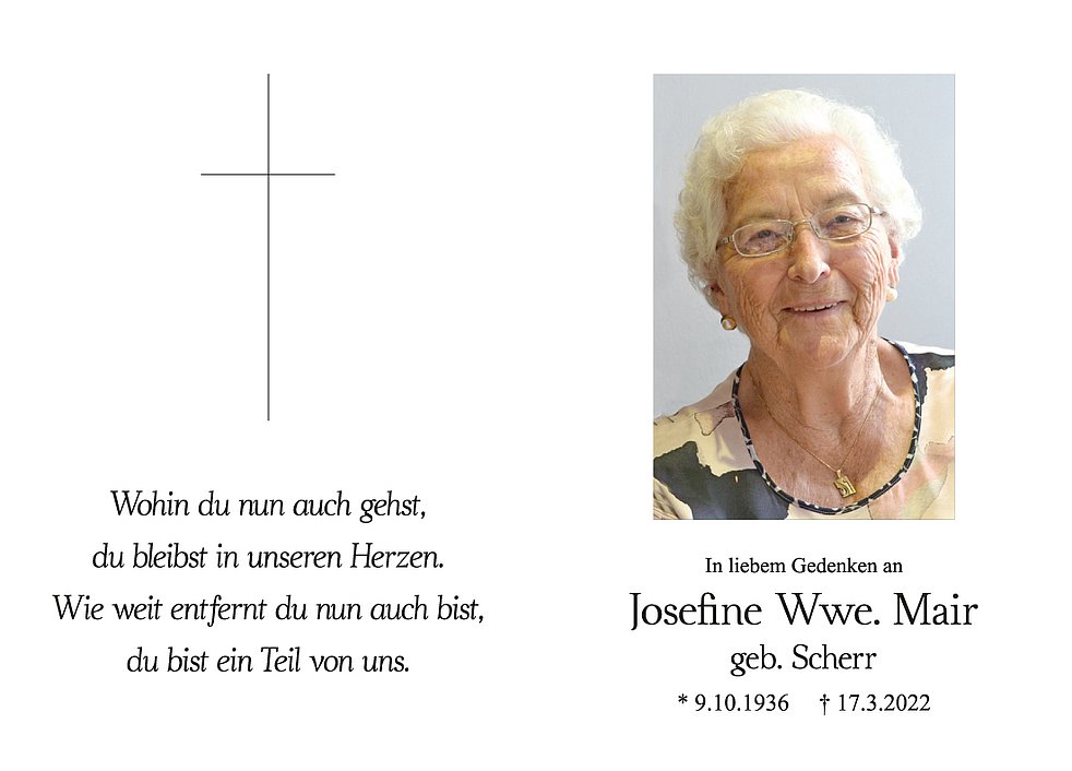 In Liebe und Dankbarkeit nehmen wir Abschied von unserer lieben Mama, Schwiegermutter, Oma, Uroma, Schwägerin, Tante und Patin, Frau