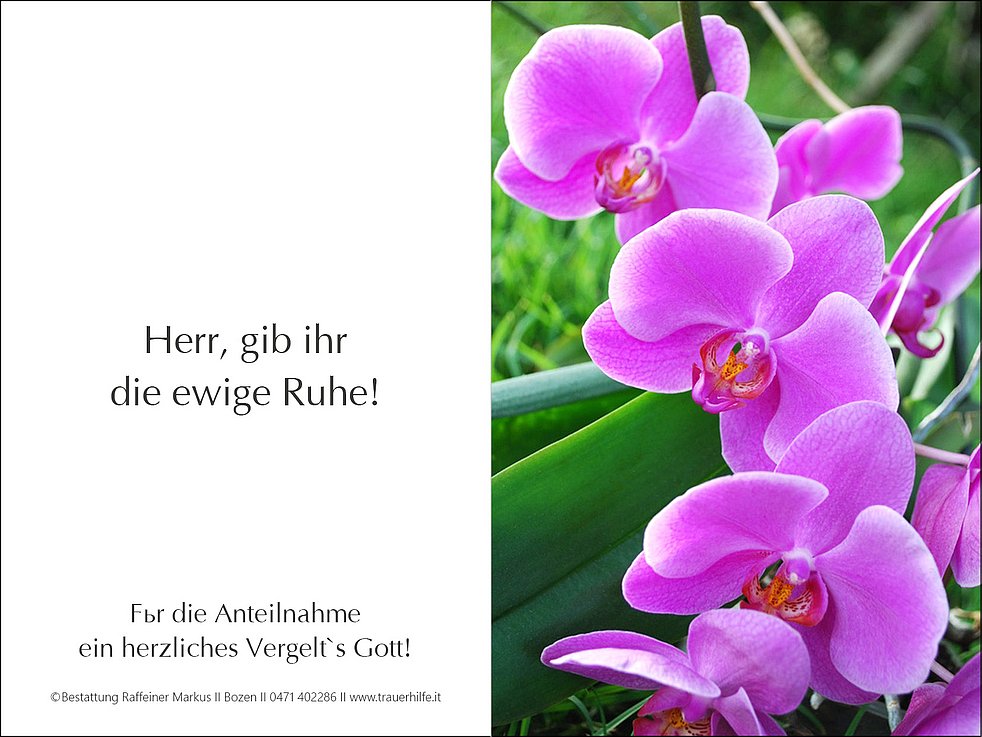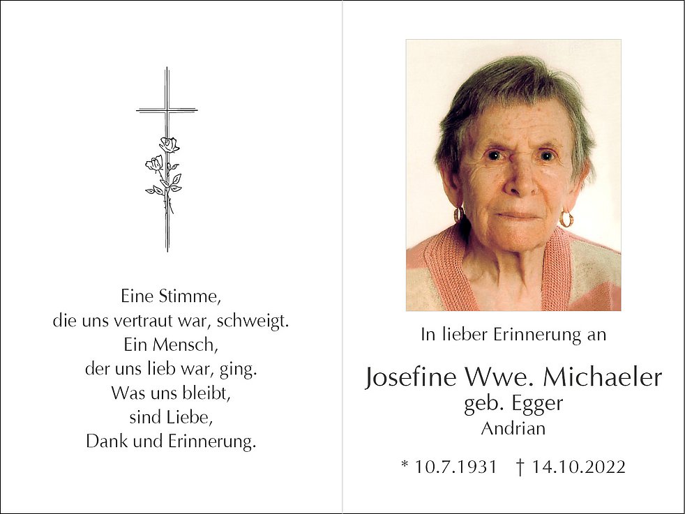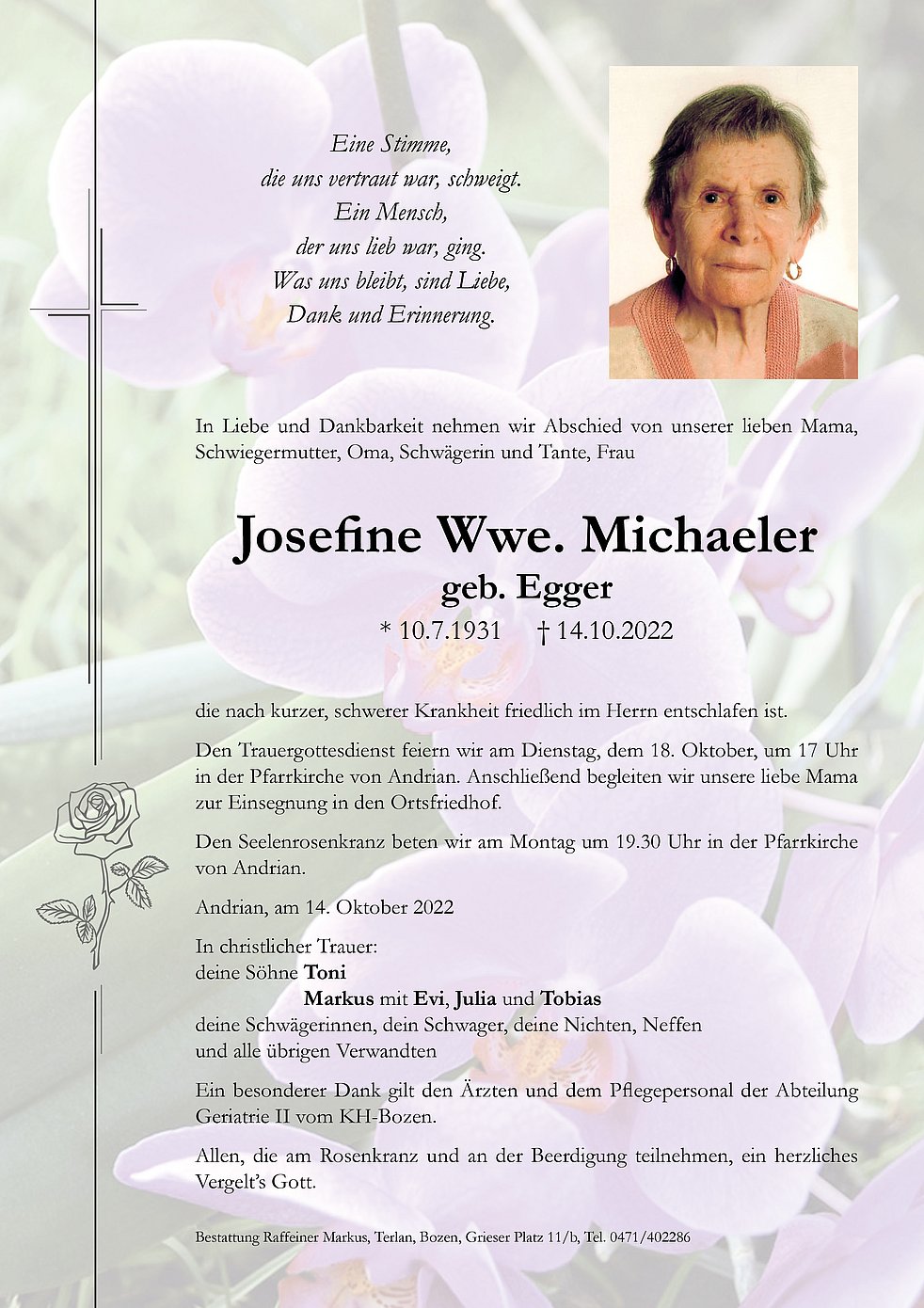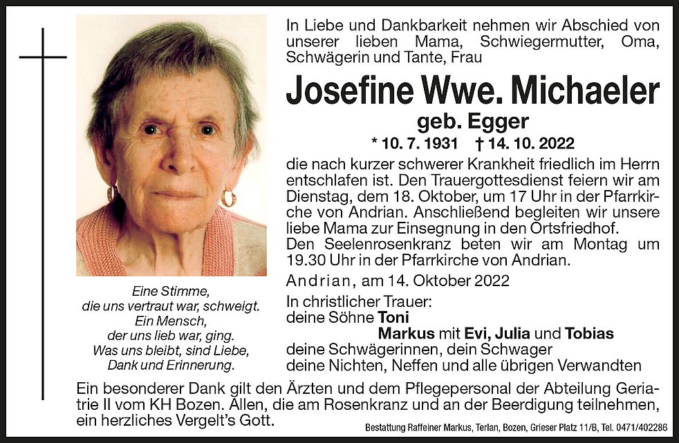 Den Trauergottesdienst feiern wir am Dienstag, dem 18. Oktober, um 17 Uhr in der Pfarrkirche von Andrian. Anschließend begleiten wir unsere liebe Mama zur Einsegnung in den Ortsfriedhof.