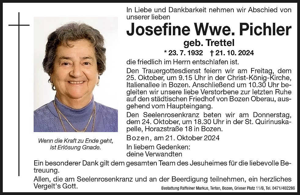 Den Trauergottesdienst feiern wir am Freitag, dem 25. Oktober, um 9.15 Uhr in der Christ-König-Kirche, Italienallee in Bozen.
