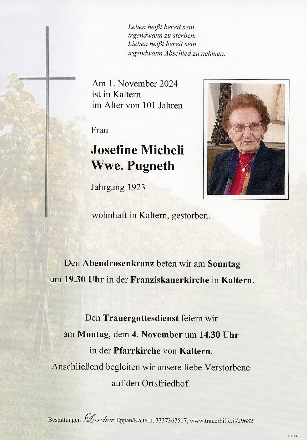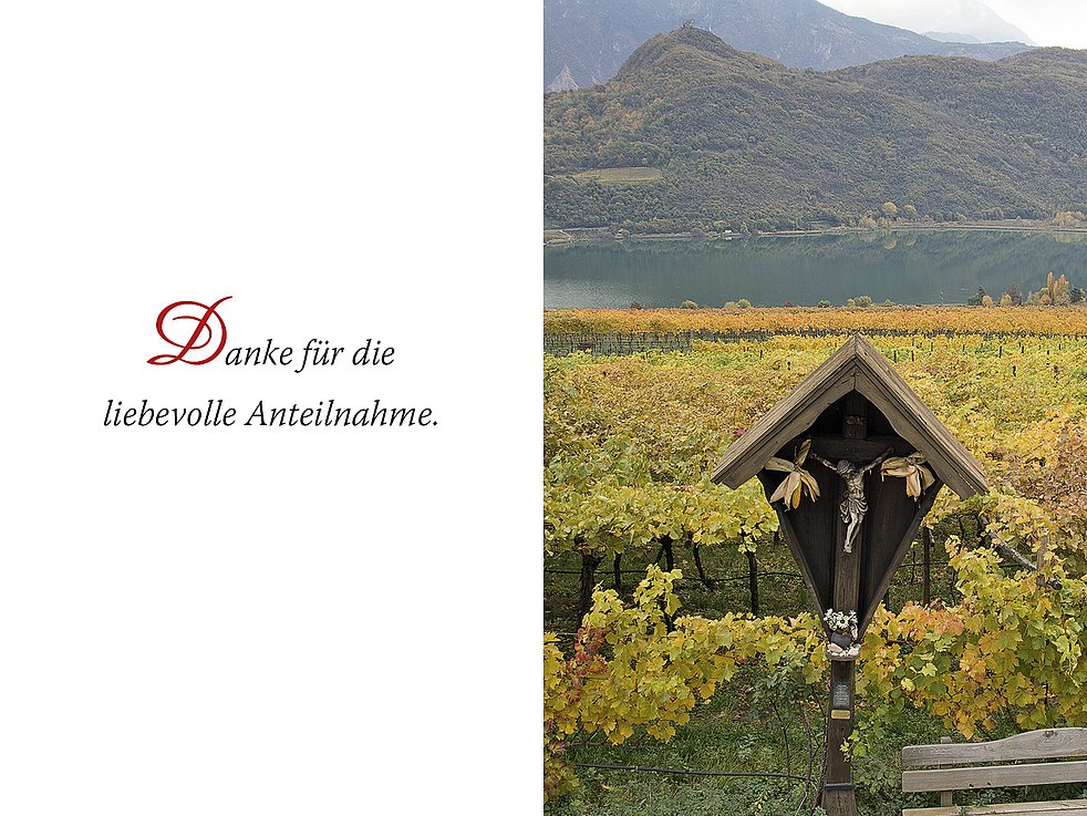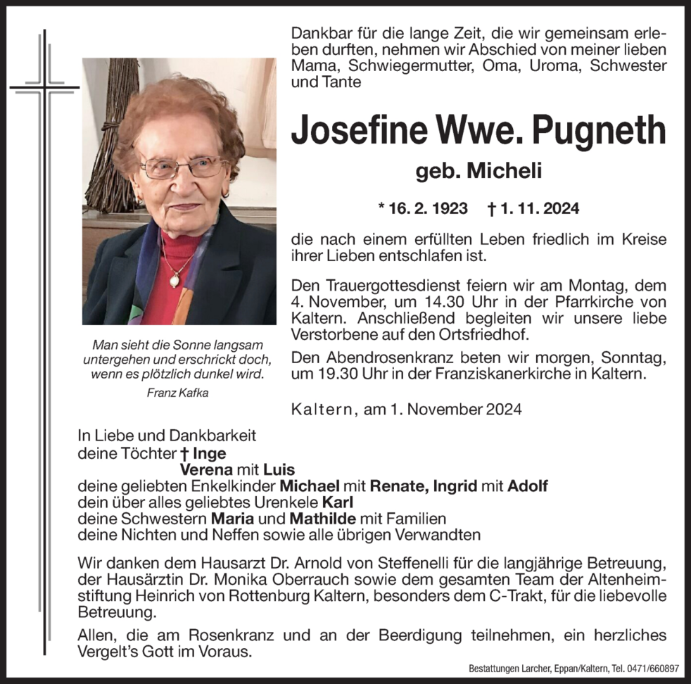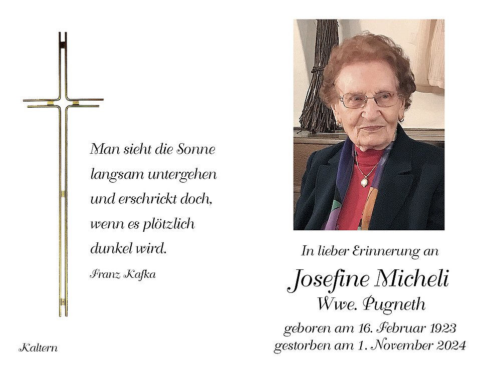 Den Trauergottesdienst feiern wir am Montag, dem 4. November um 14.30 Uhr in der Pfarrkirche von Kaltern. Anschließend begleiten wir unsere liebe Verstorbene auf den Ortsfriedhof.