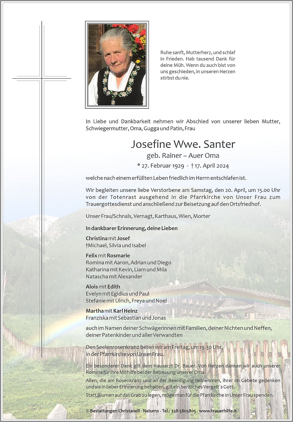 Wir begleiten unsere liebe Verstorbene am Samstag, den 20. April, um 15.00 Uhr von der Totenrast ausgehend in die Pfarrkirche von Unser Frau zum Trauergottesdienst und anschließend zur Beisetzung auf den Ortsfriedhof.