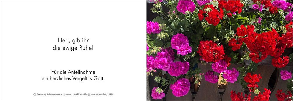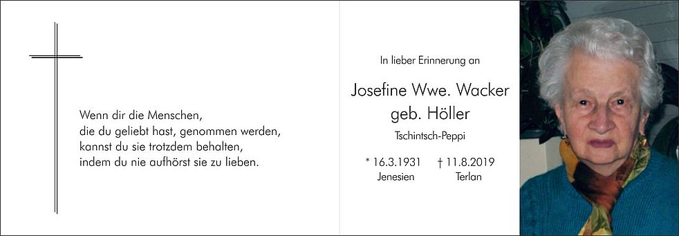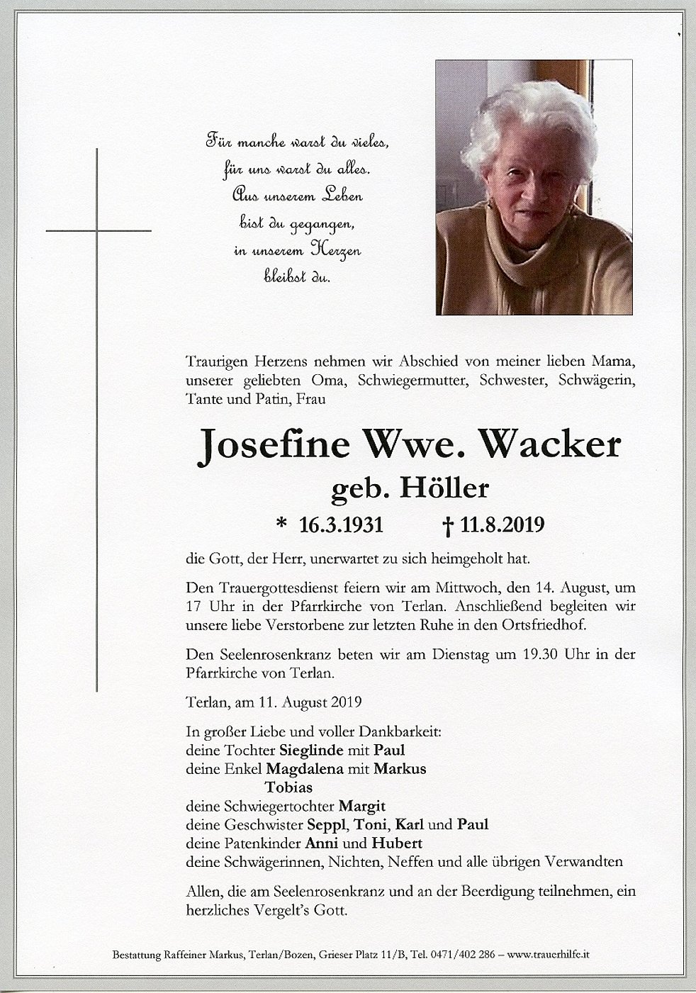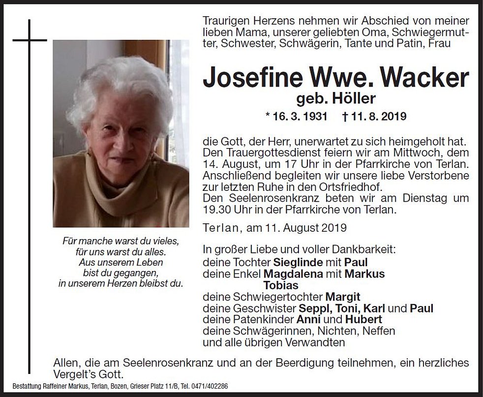 Den Trauergottesdienst feiern wir am Mittwoch, dem 14. August, um 17 Uhr in der Pfarrkirche von Terlan. Anschließend begleiten wir unsere liebe Verstorbene zur letzten Ruhe in den Ortsfriedhof.